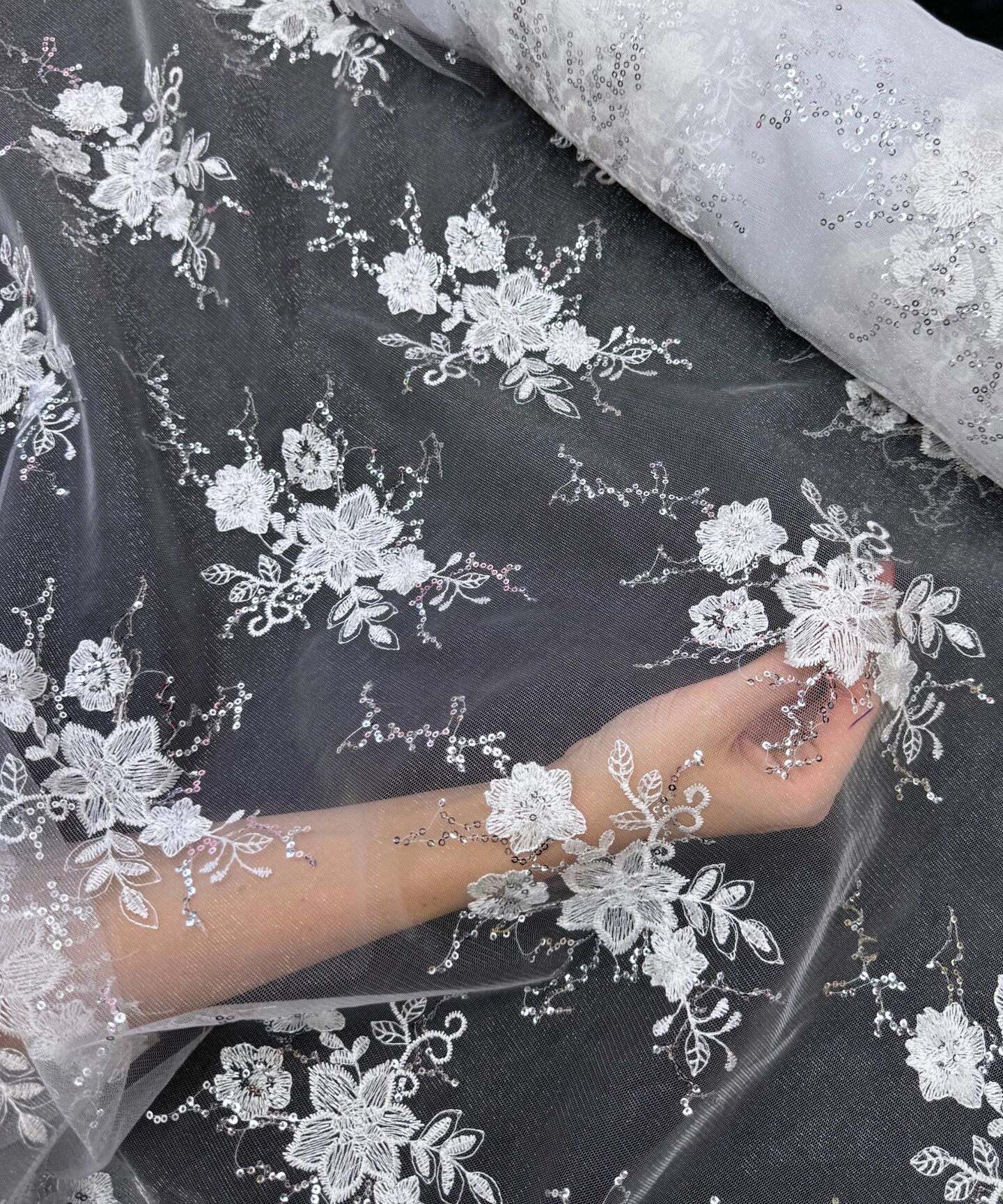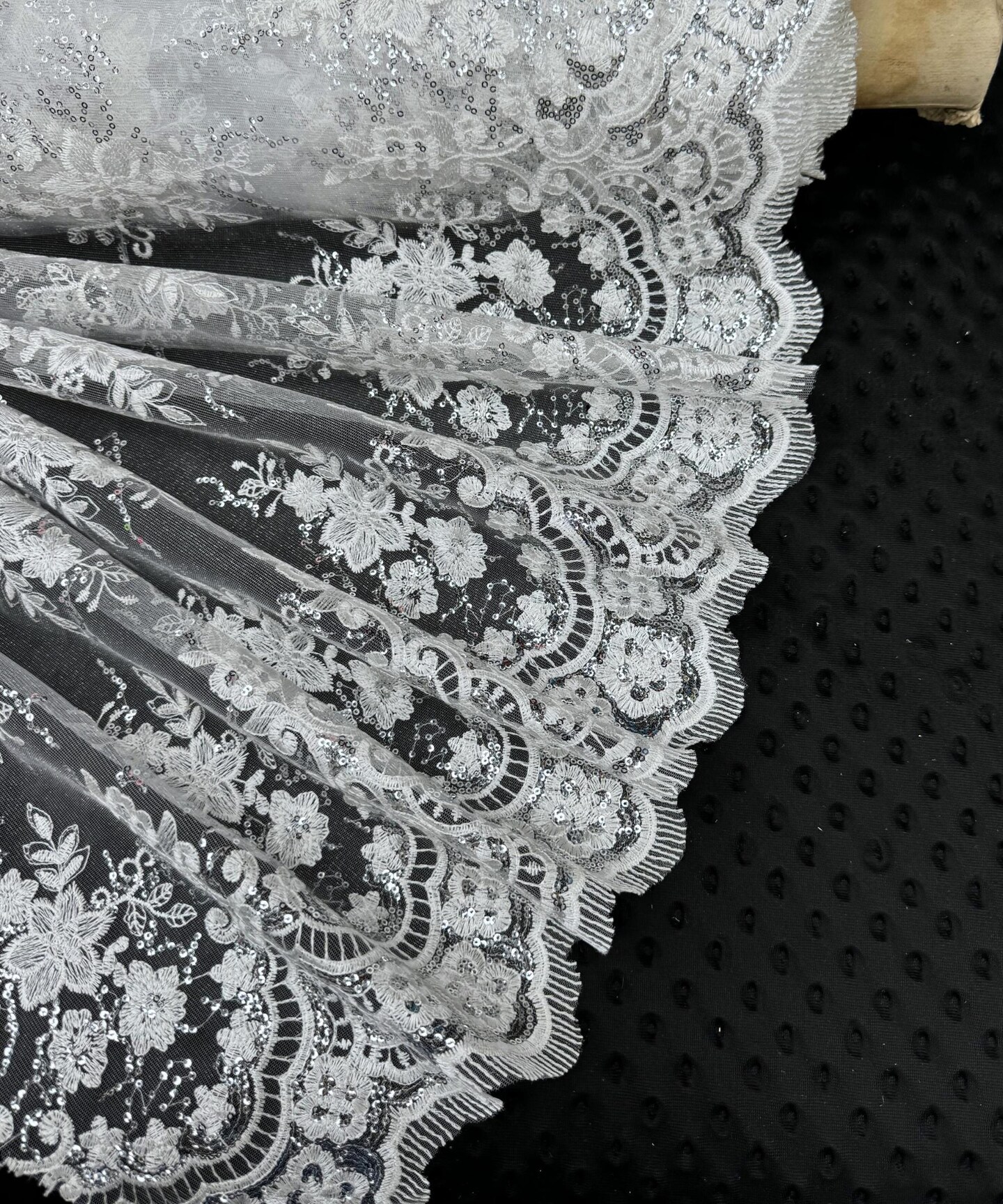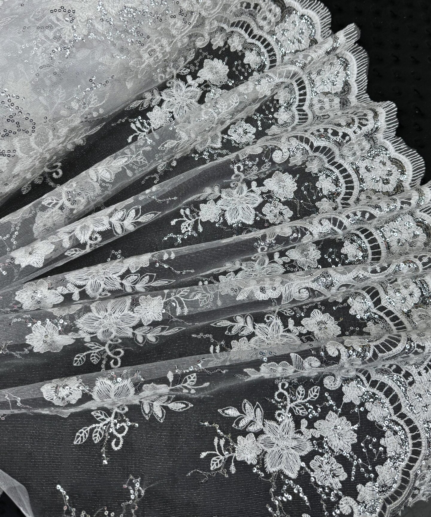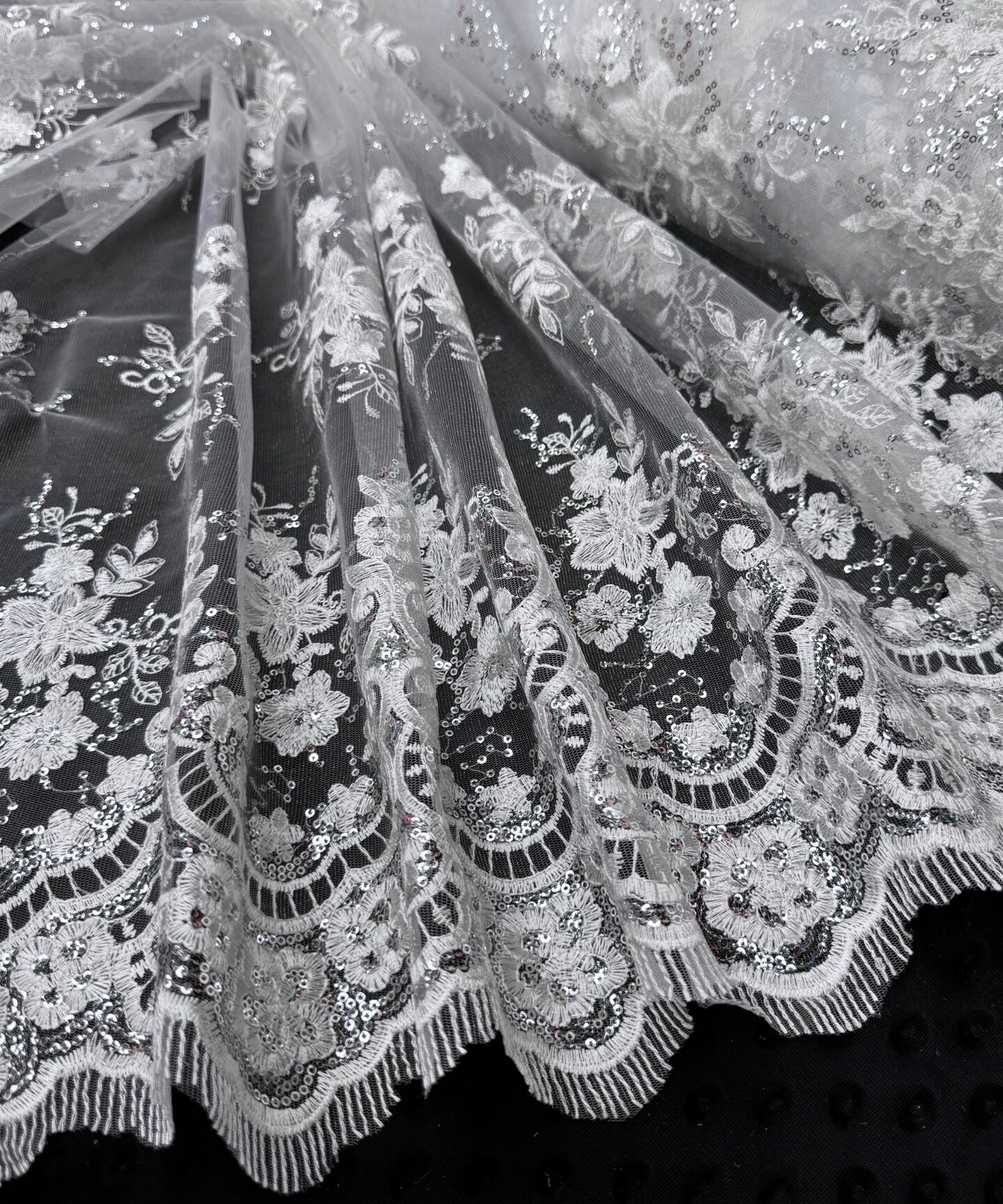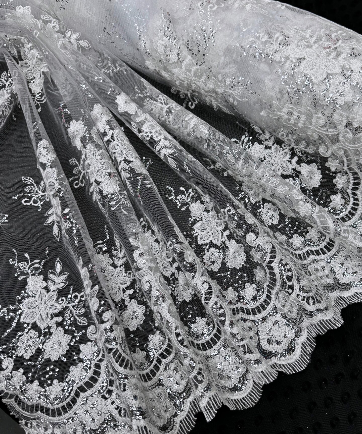 White Sequin Embroidered Lace Fabric by the Yard, 54" Wide Floral Mesh Lace with Double Scalloped Edges