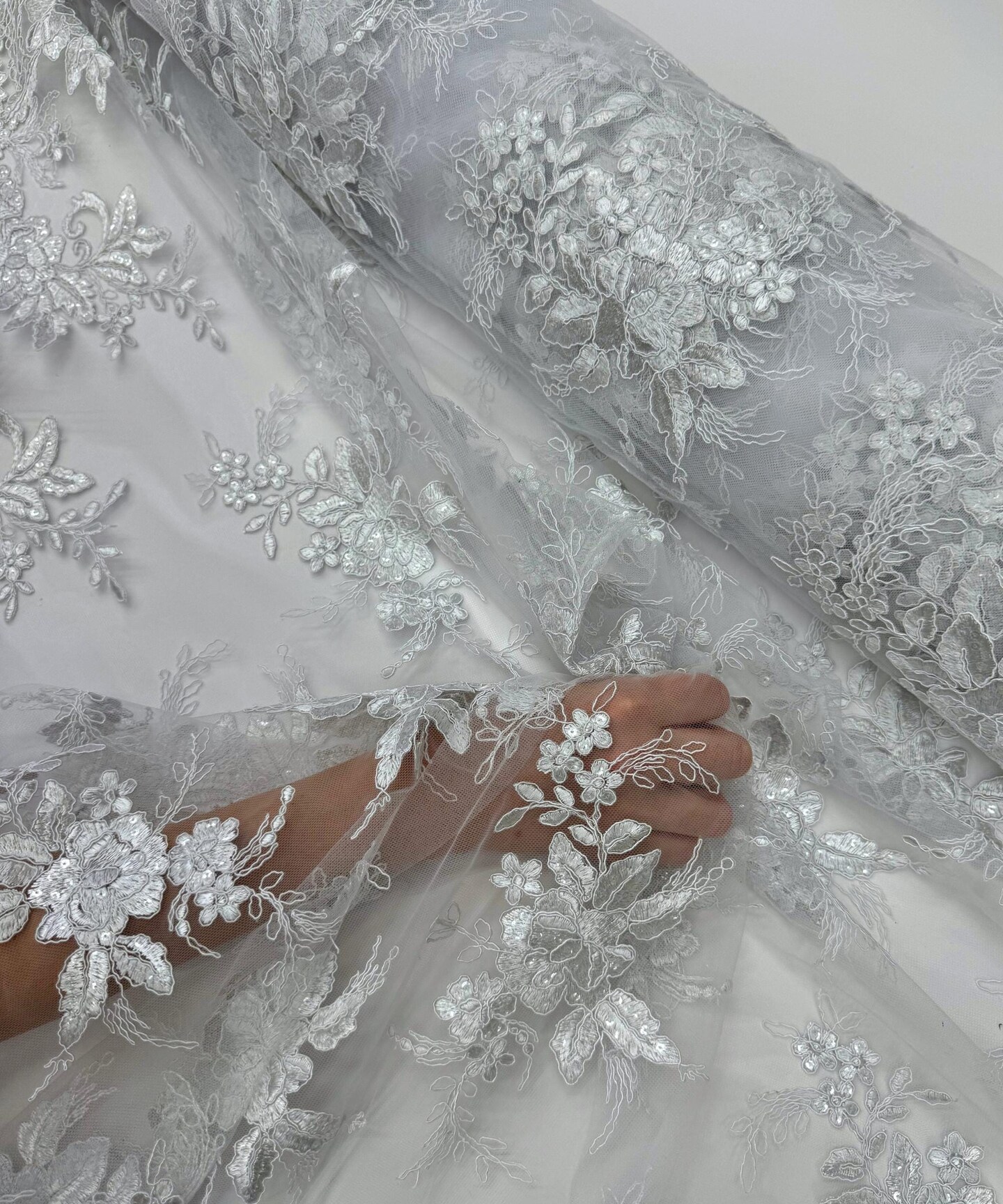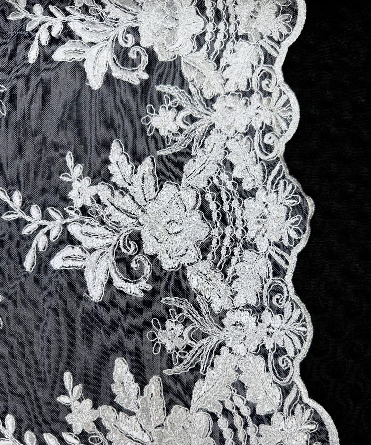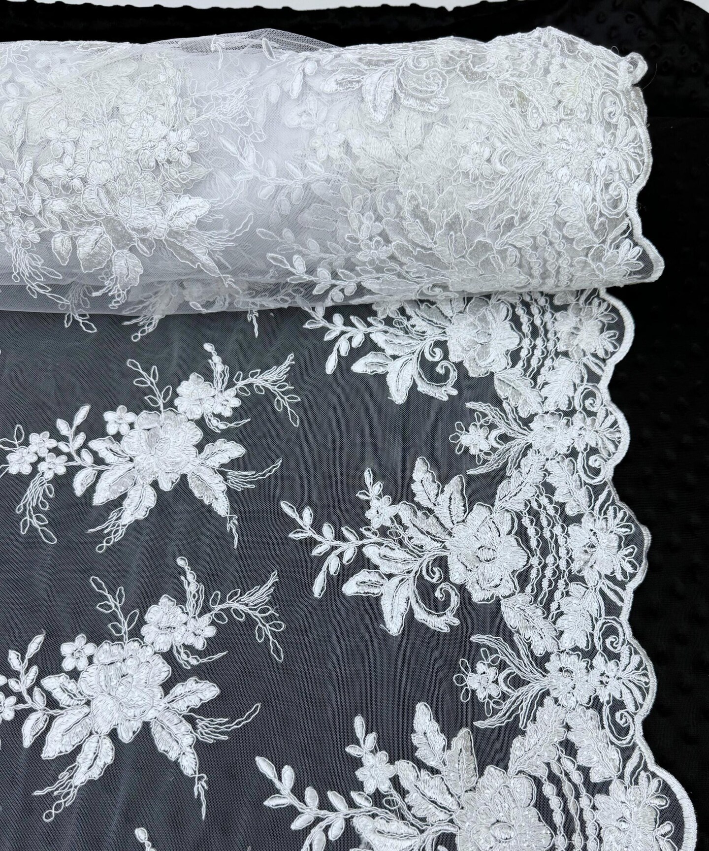 White Sequin Embroidered Lace Fabric by the Yard, 54" Wide Floral Mesh Lace with Double Scalloped Edges