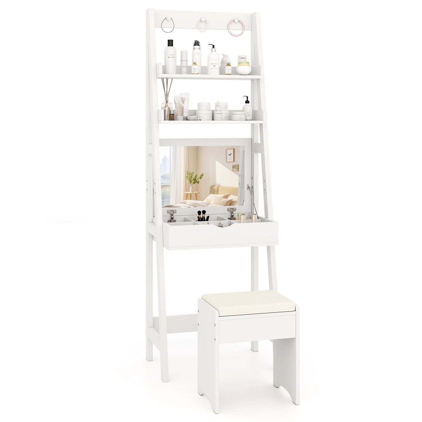 White Vanity Desk Set with Flip Top Mirror and Hidden Storage Compartments Cushioned Stool