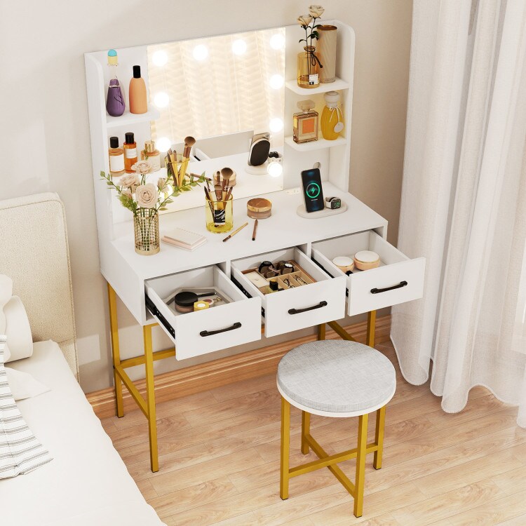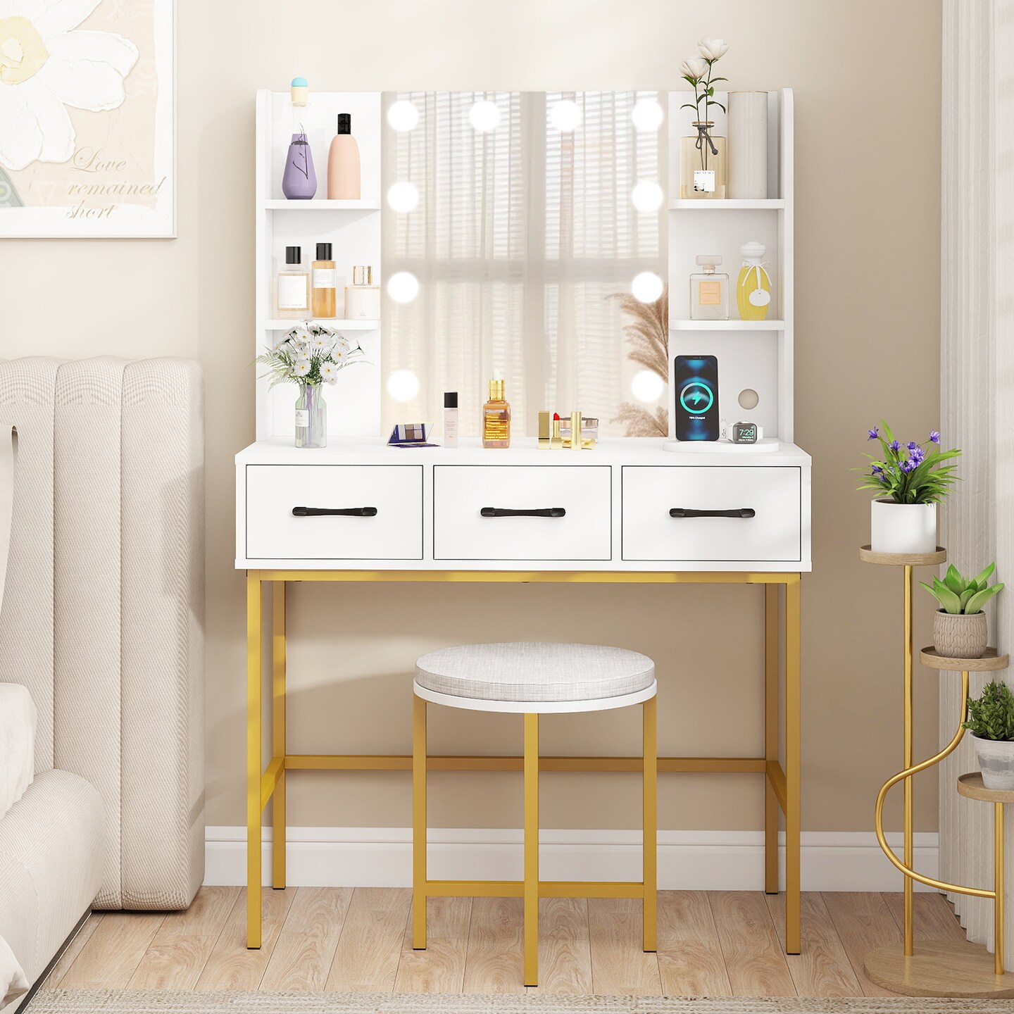 White Vanity Table with Lighted Mirror, 3 Dimmable Modes, Storage Drawers & Charging Station with Cushioned Stool