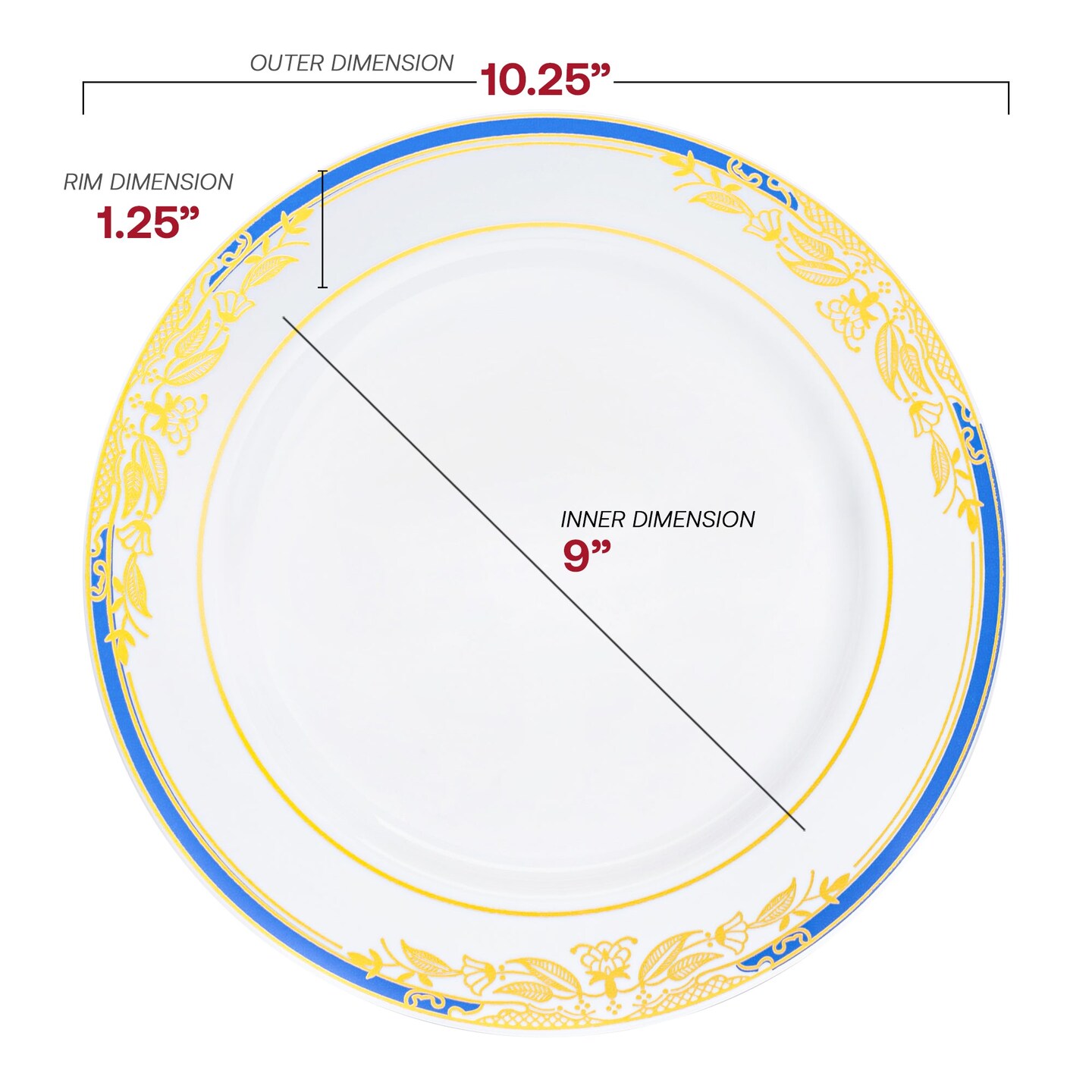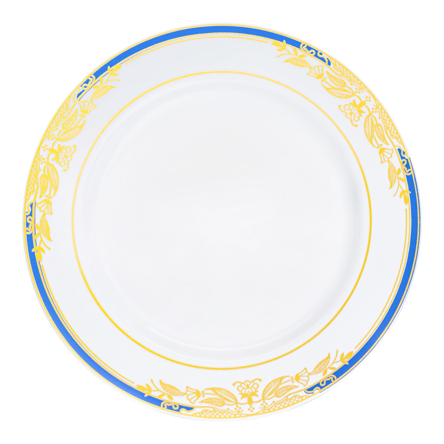 White with Blue and Gold Harmony Rim Plastic Dinner Plates - 10.25" (120 Plates)