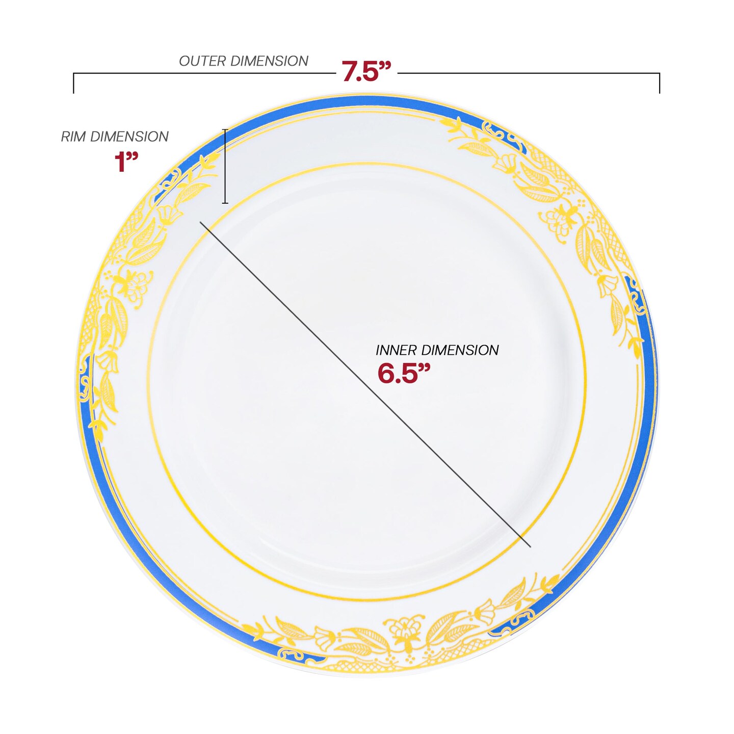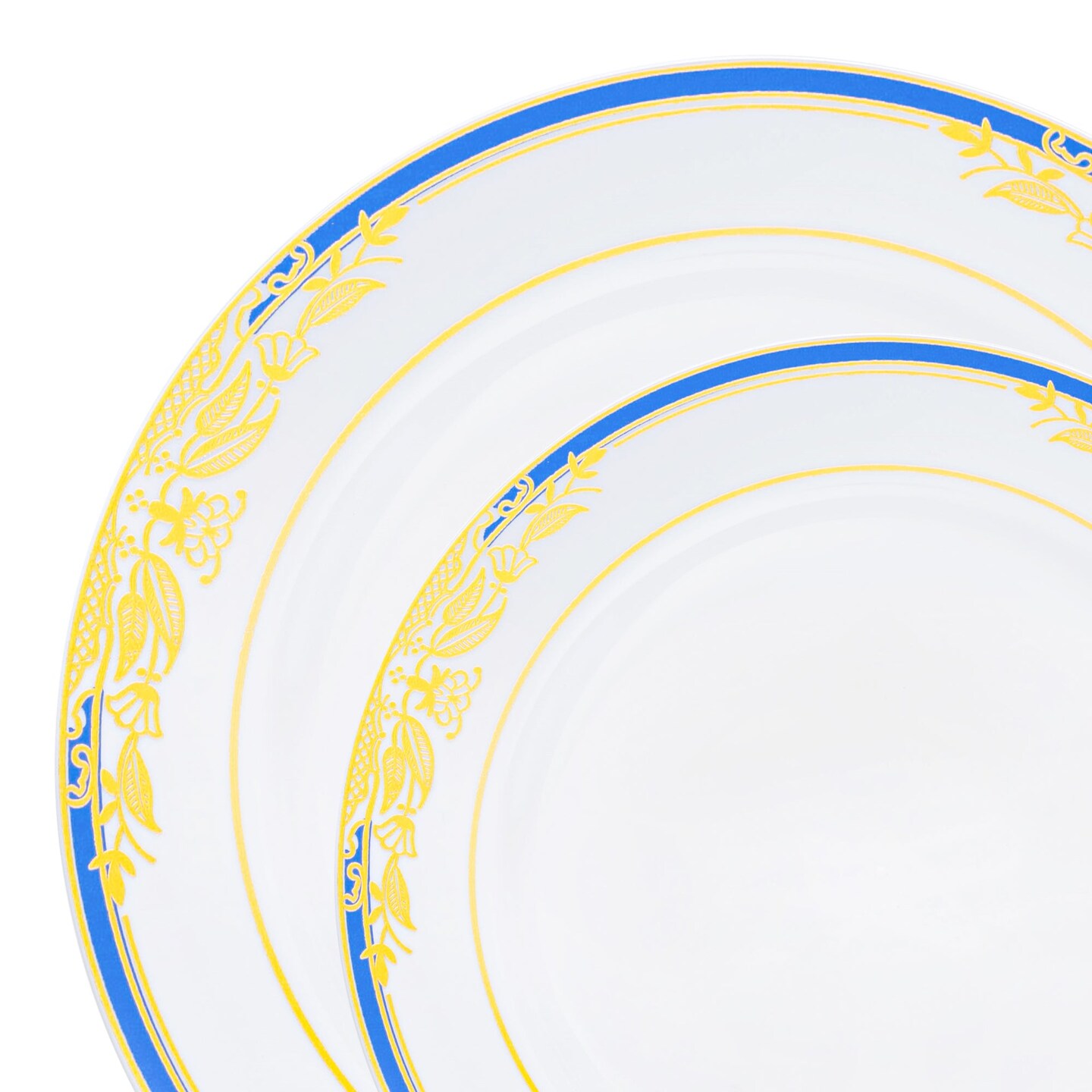 White with Blue and Gold Harmony Rim Plastic Dinnerware Value Set (120 Guests)