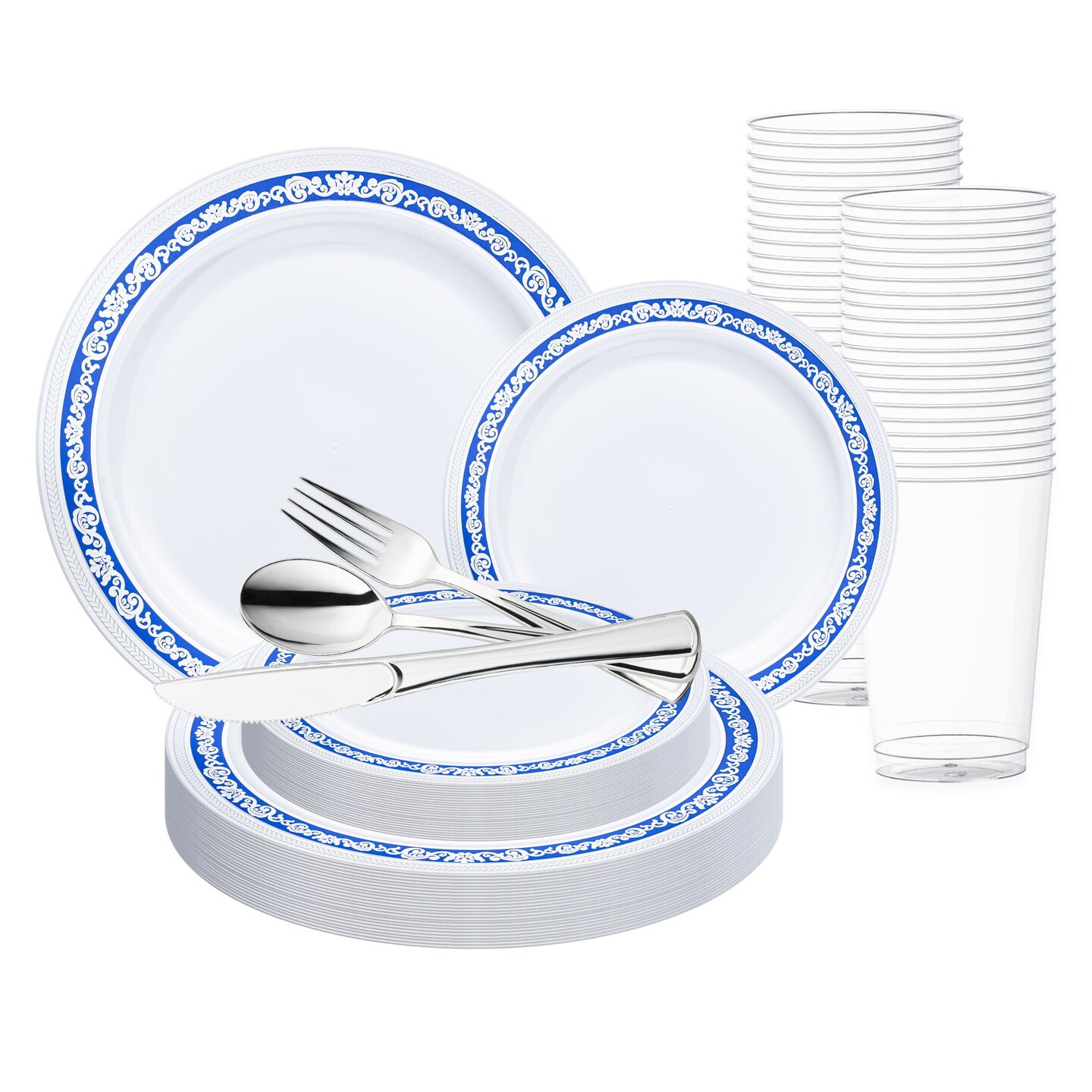 White with Blue and Silver Royal Rim Plastic Wedding Value Set (20 Settings)
