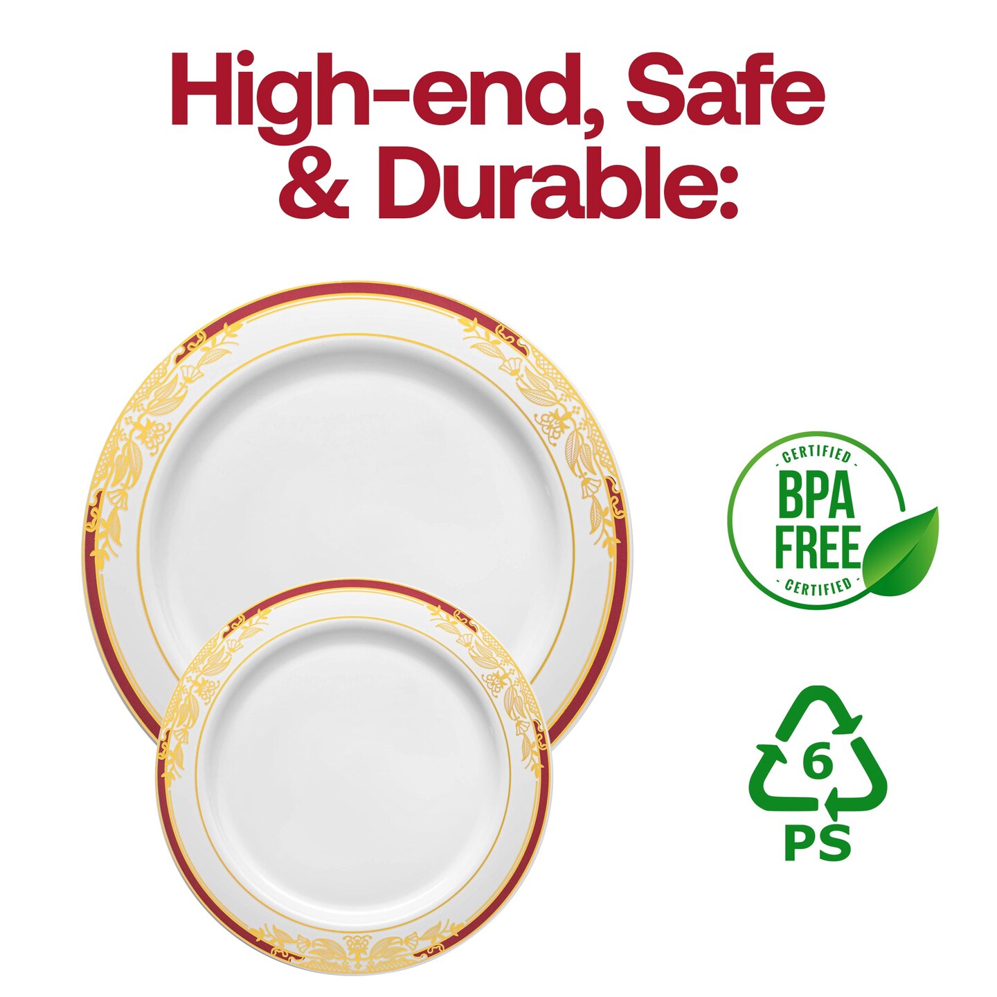 White with Burgundy and Gold Harmony Rim Plastic Dinner Plates - 10.25" (120 Plates)