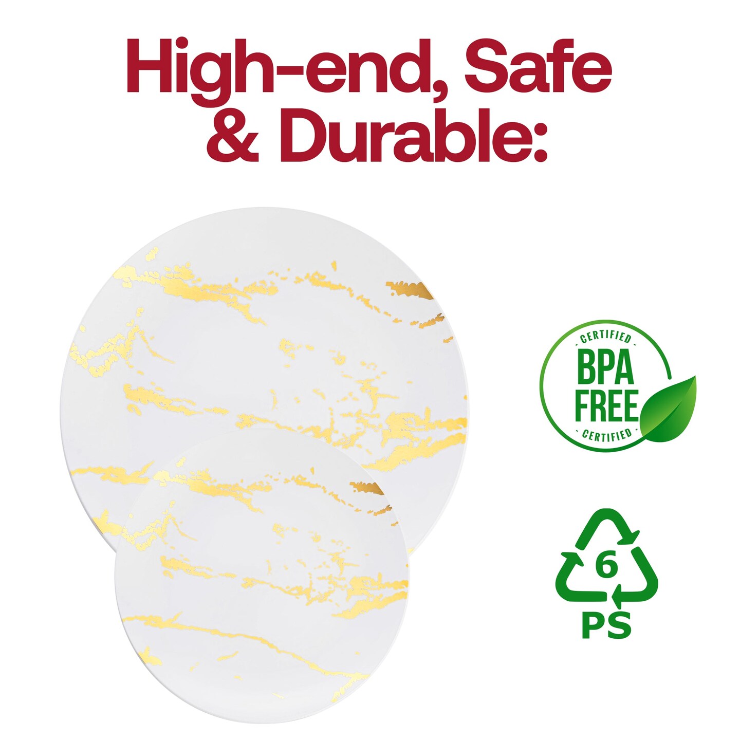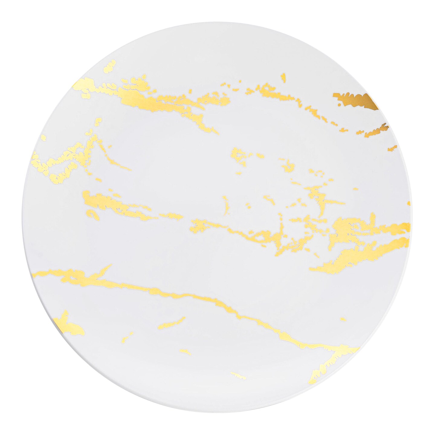 White with Gold Marble Stroke Round Disposable Plastic Dinner Plates - 10.25" (120 Plates)
