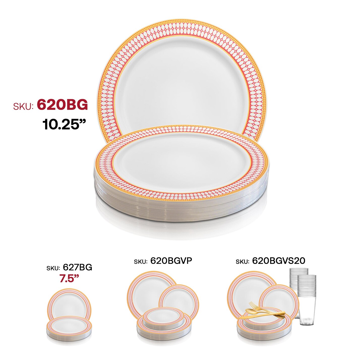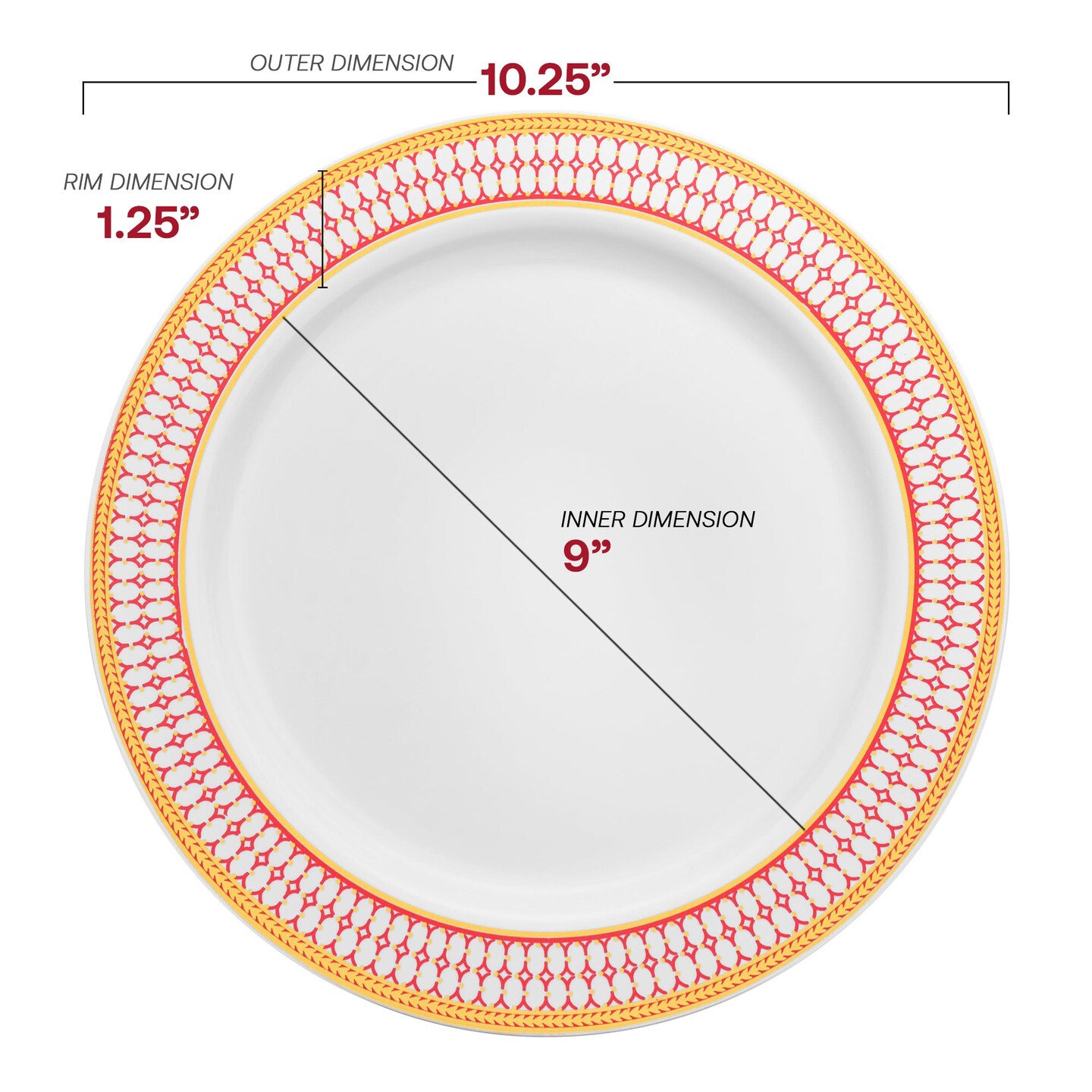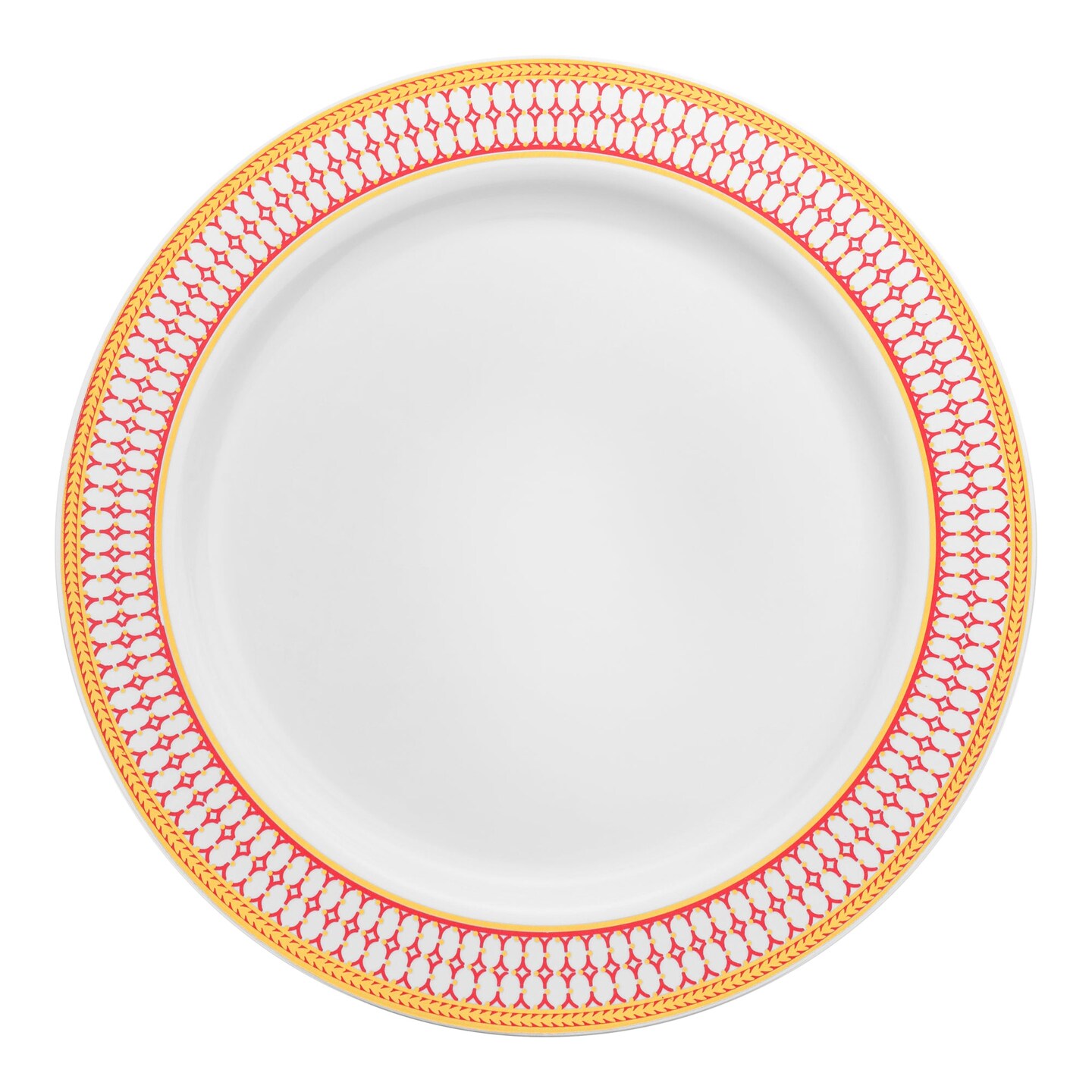 White with Red and Gold Chord Rim Plastic Dinner Plates - 10.25" (120 Plates)