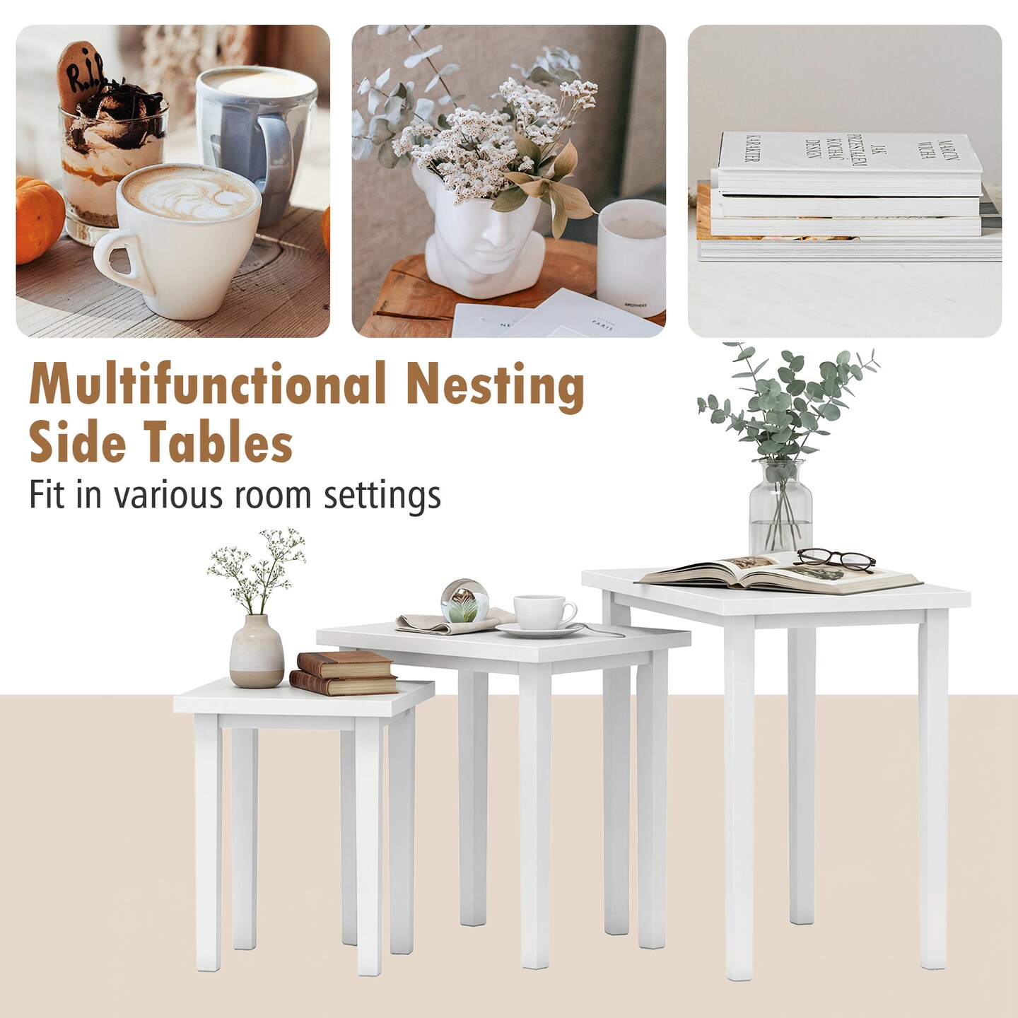 White Wood Nesting Tables Set 3PCS Space-Saving Farmhouse Side Tables