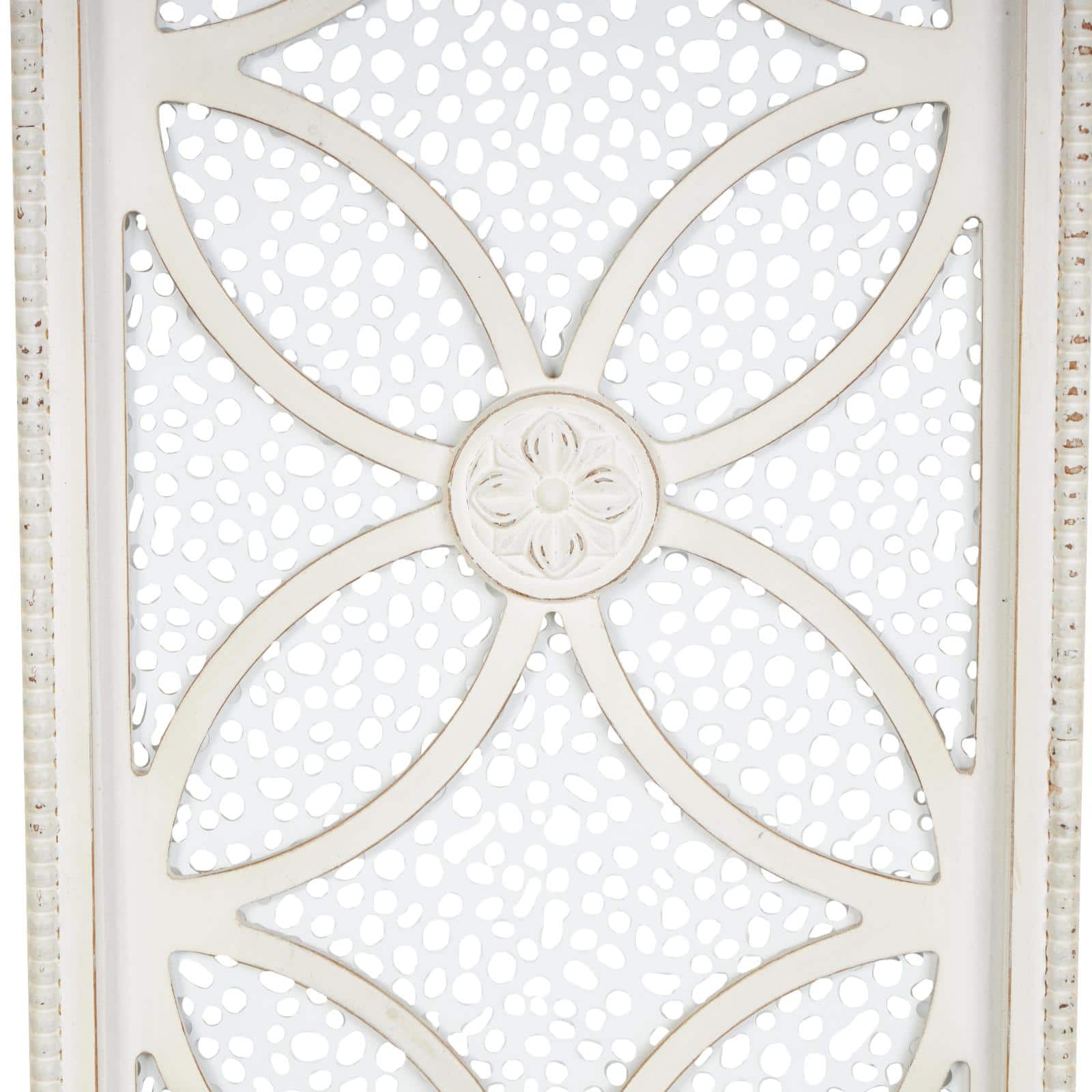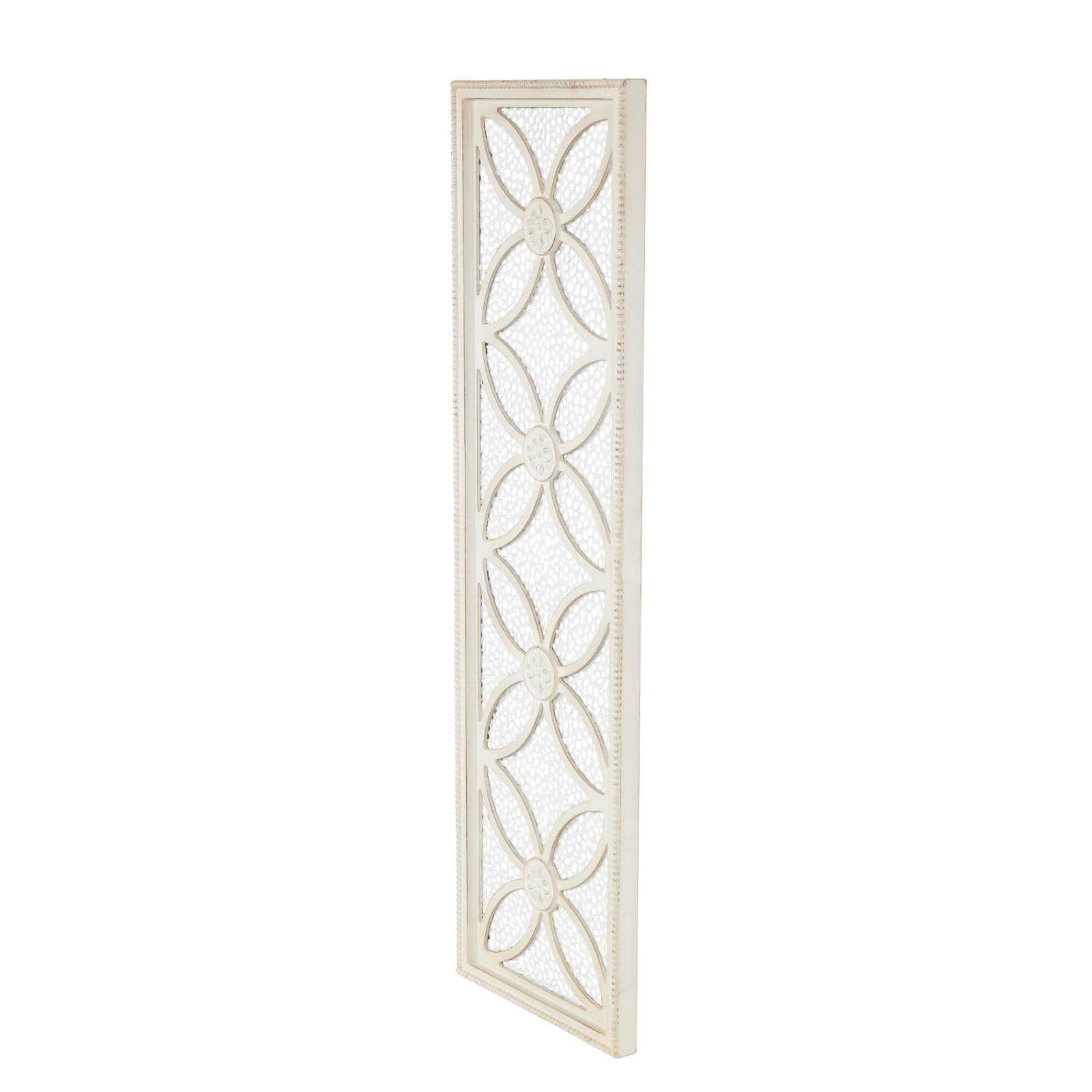 White wooden floral panel wall decor with cutout metal backing and beaded frame.