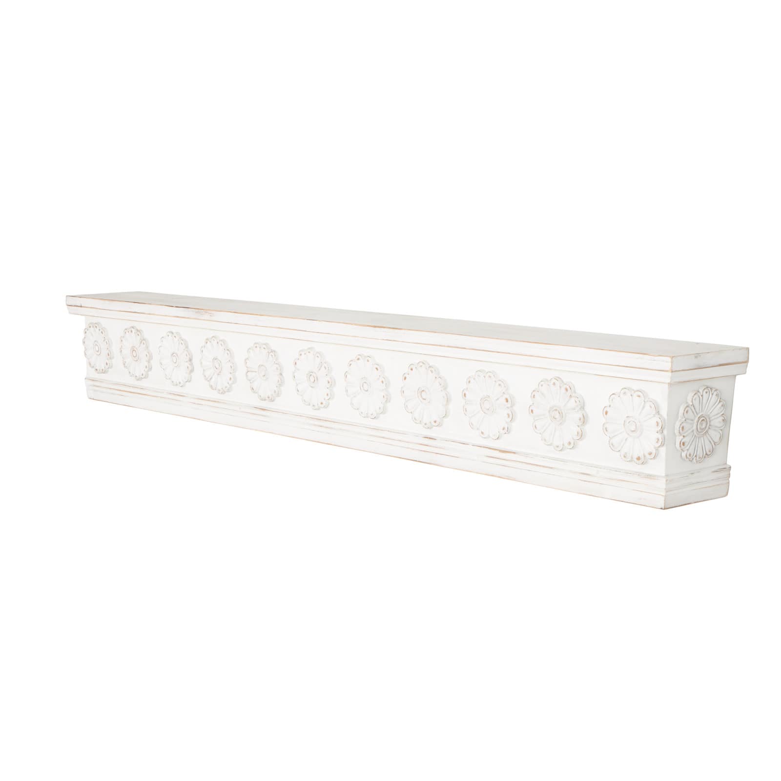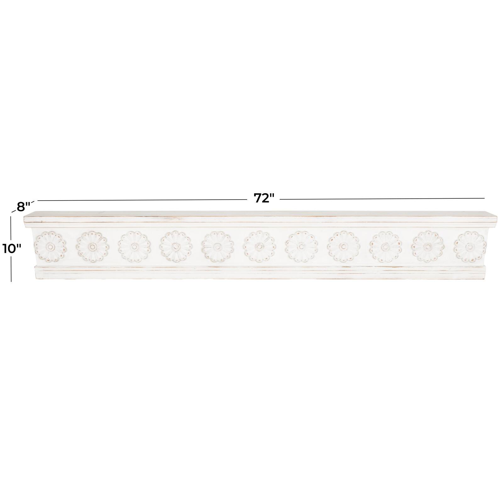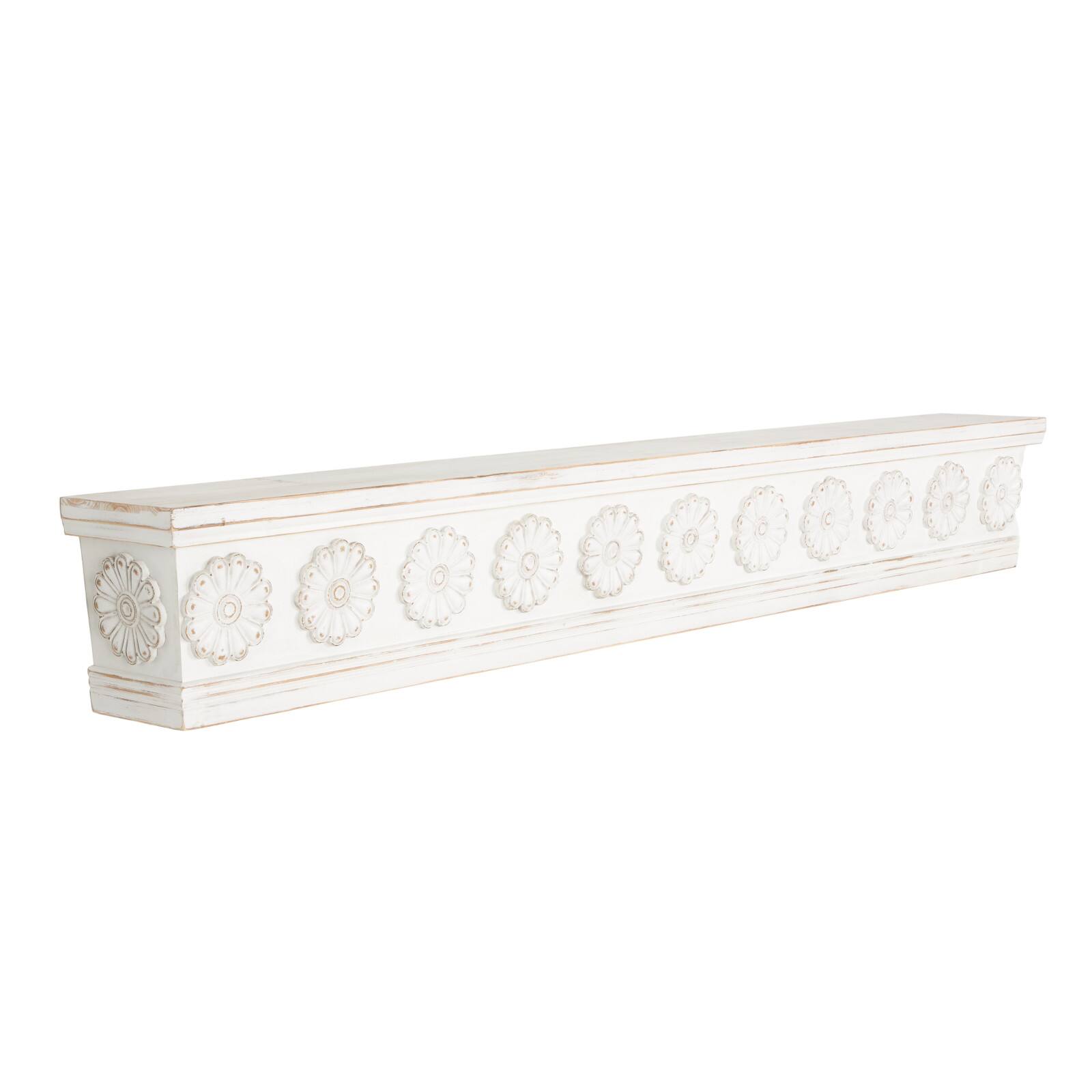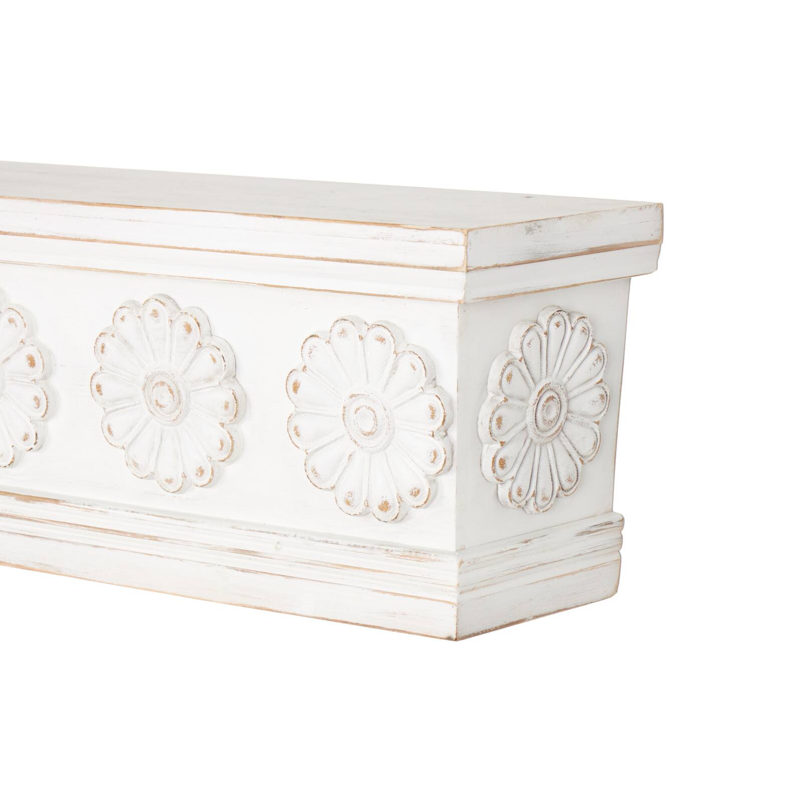 White Wooden Floral Room Wall Shelf with Brown Distressing