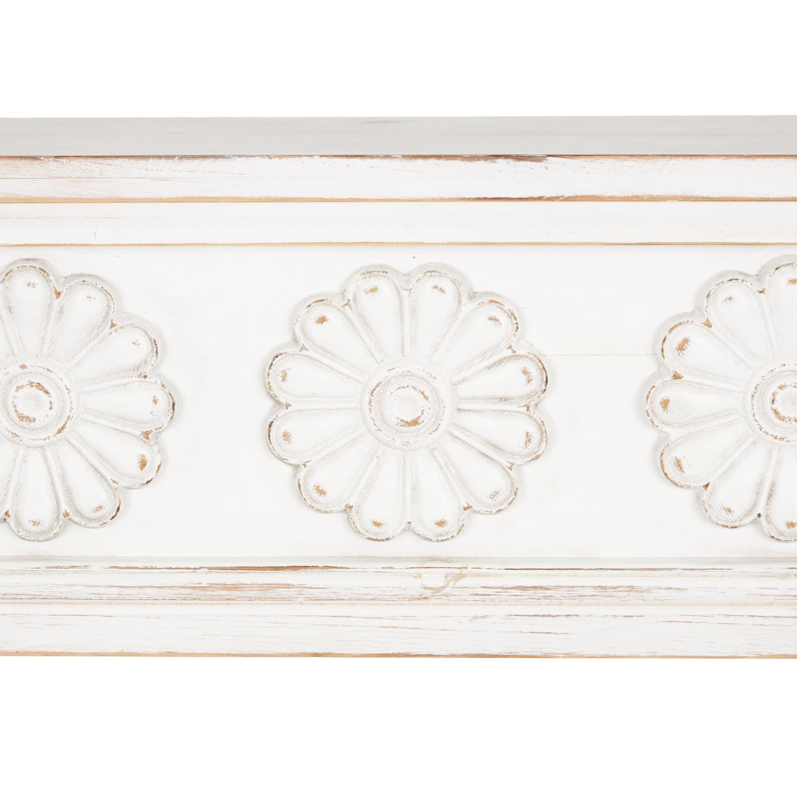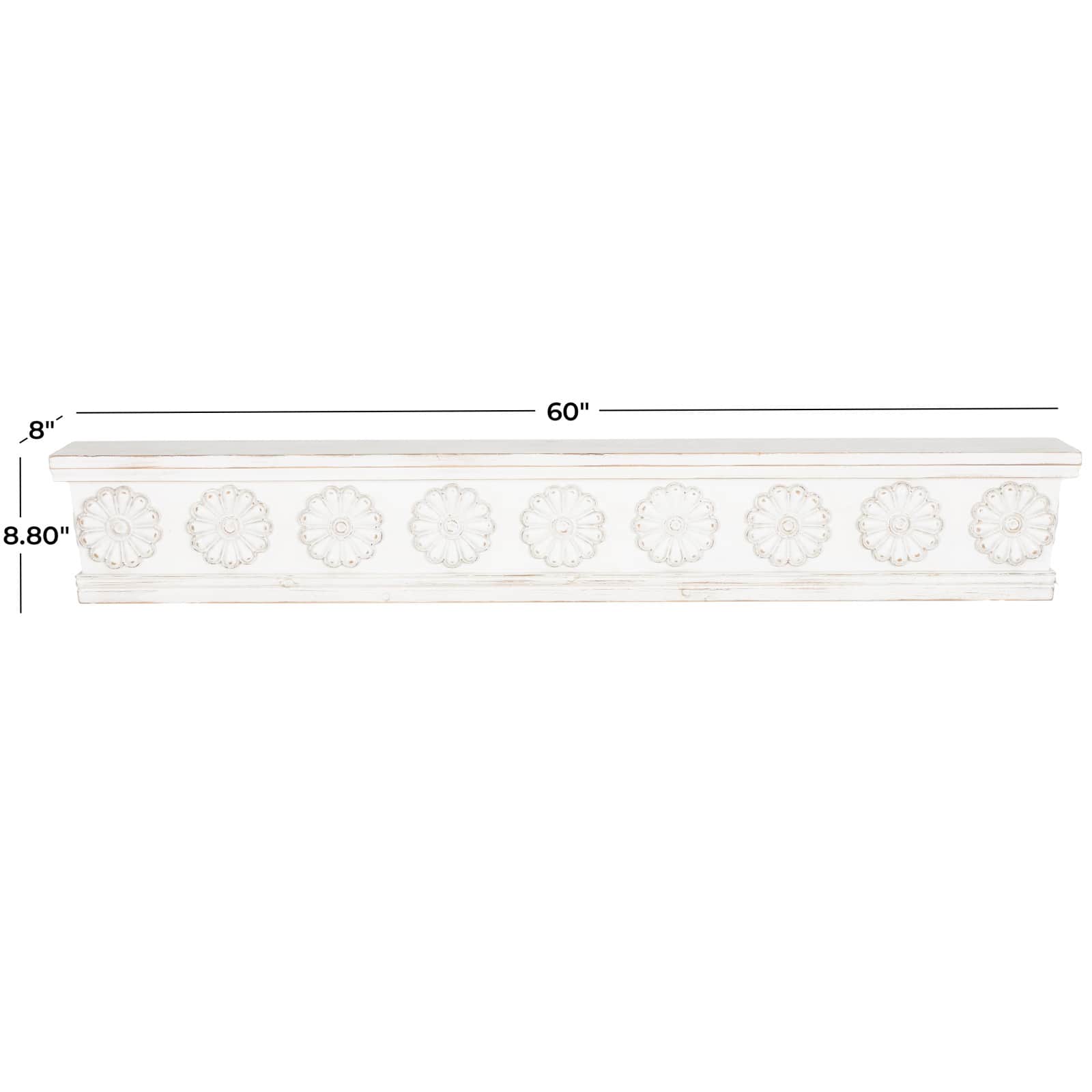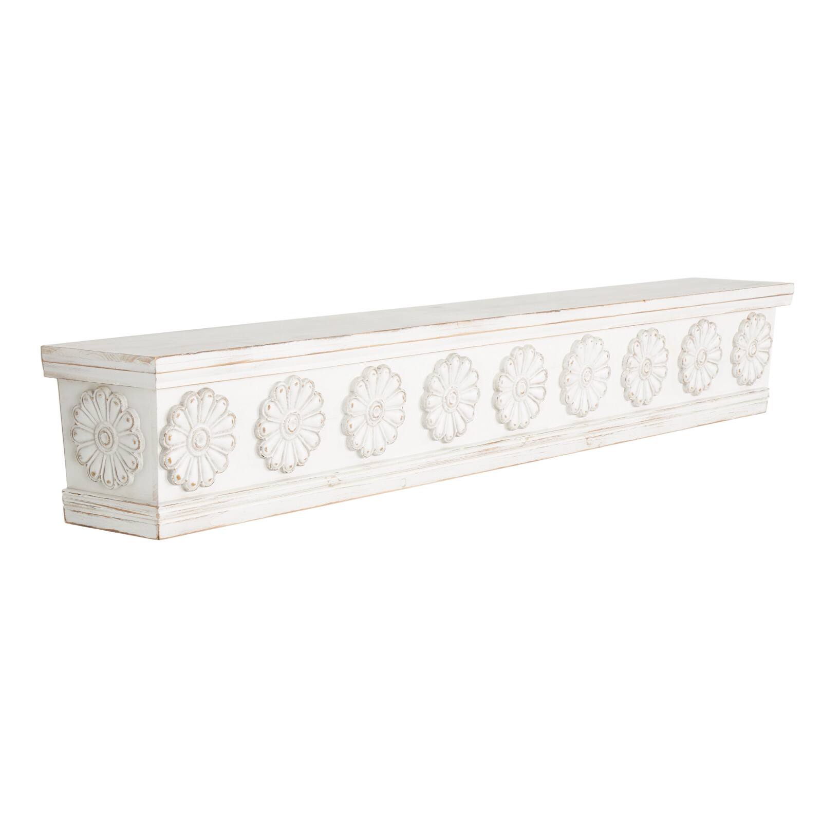 White Wooden Floral Room Wall Shelf with Brown Distressing