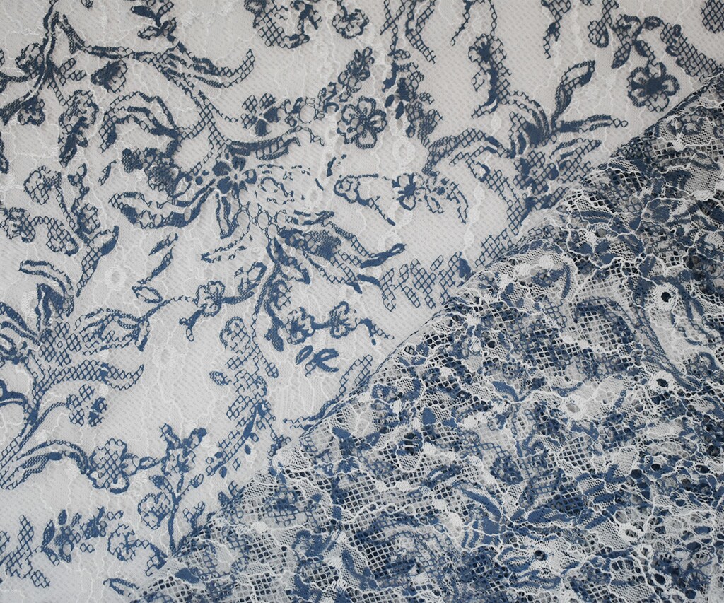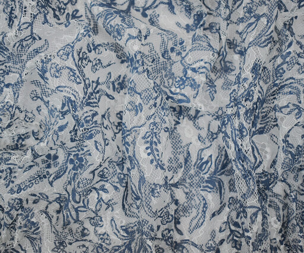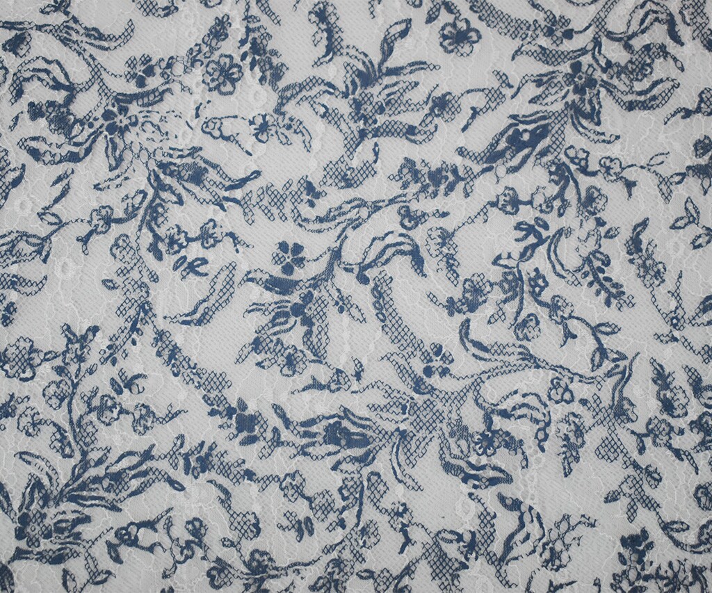 White-Blue Nylon Floral Vine Printed Lace Mesh Knit Fabric By the Yard