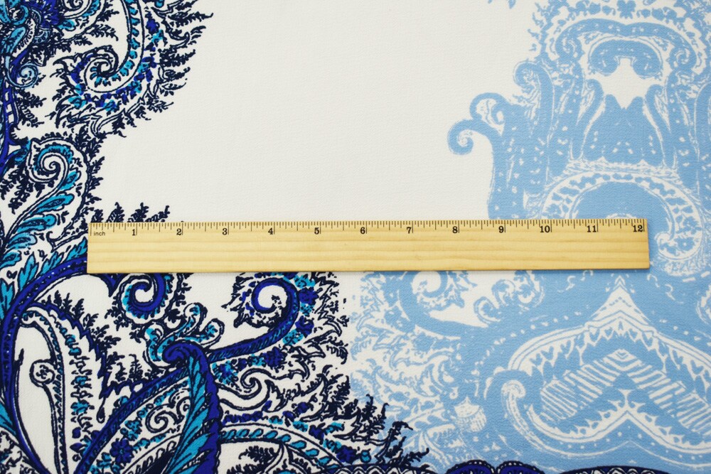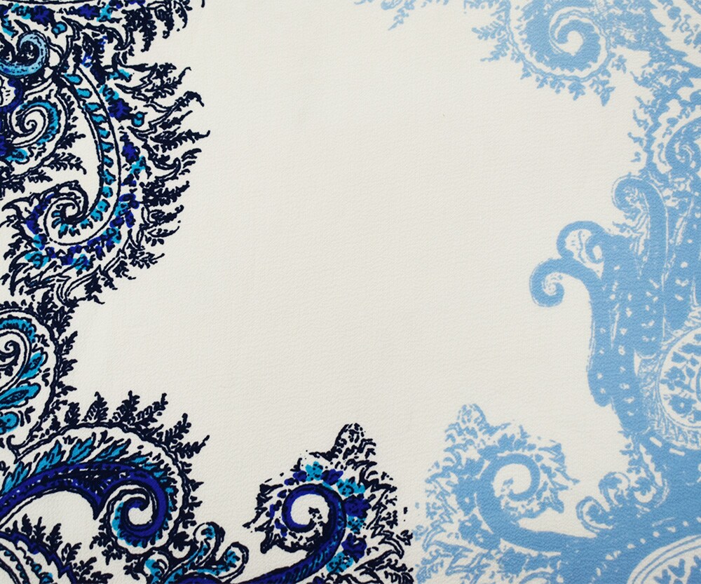White-Blue-Black Poly Baroque Border Printed Pebble Crepe Woven Fabric By the Yard