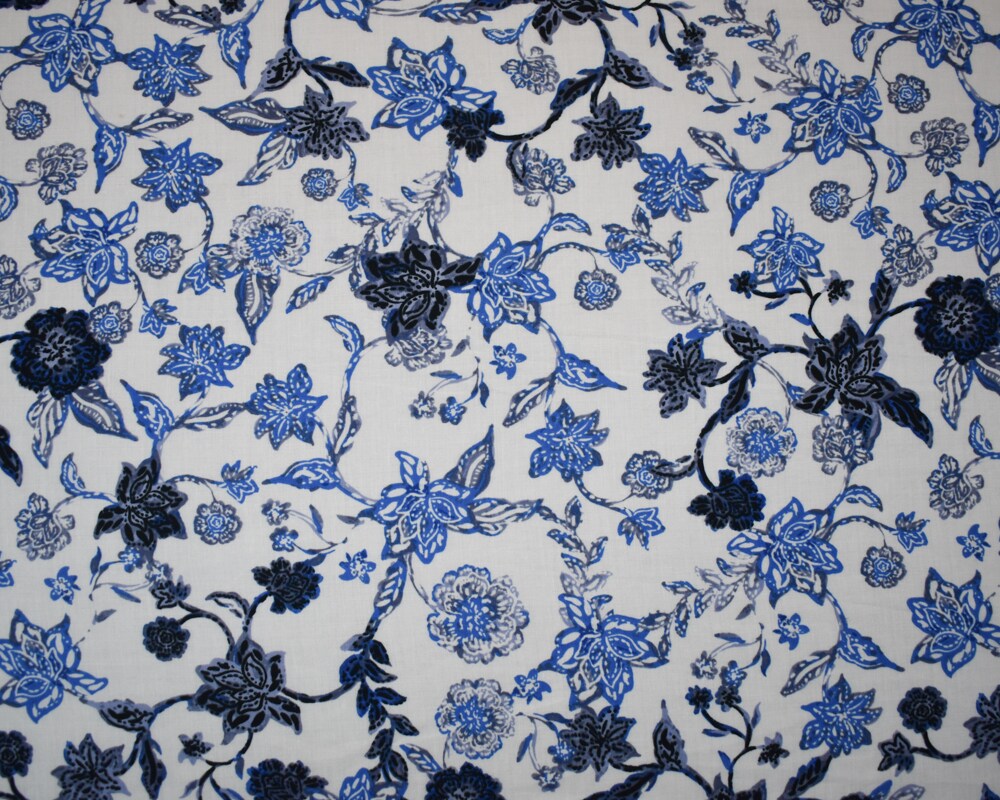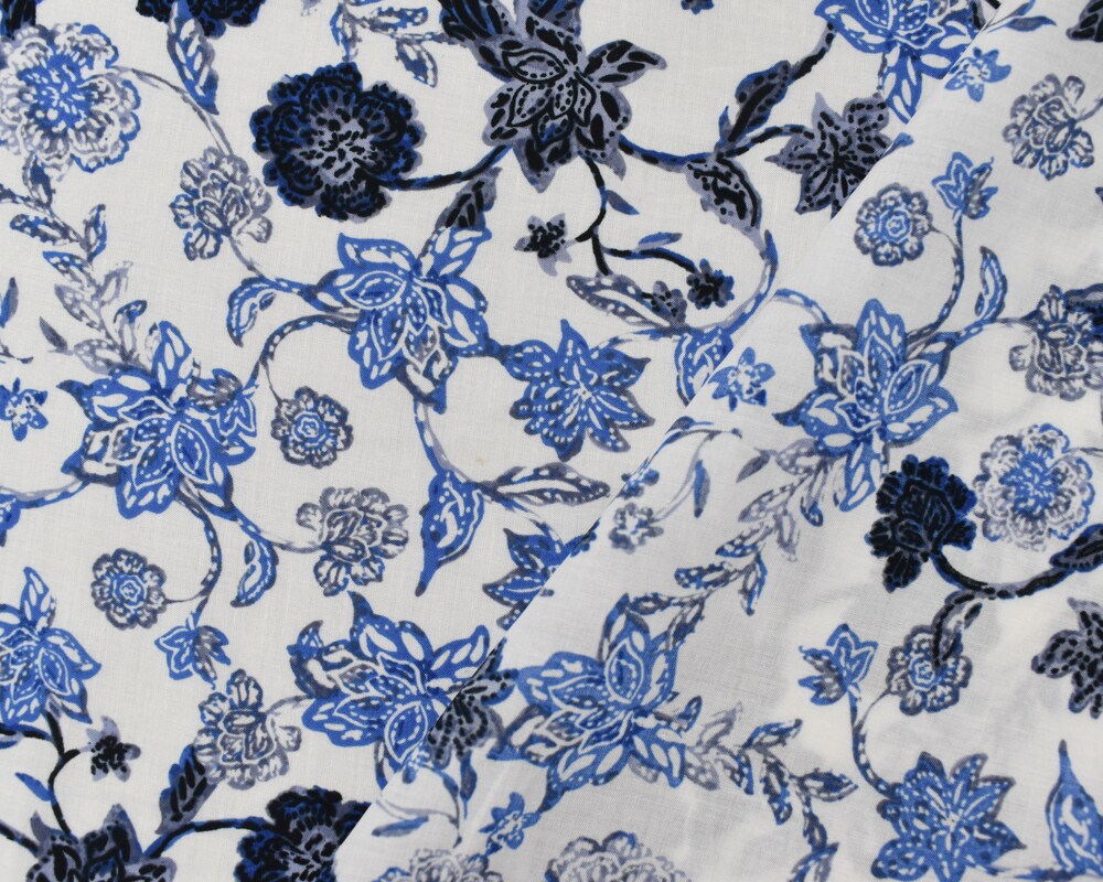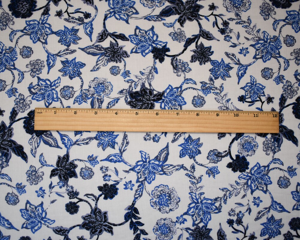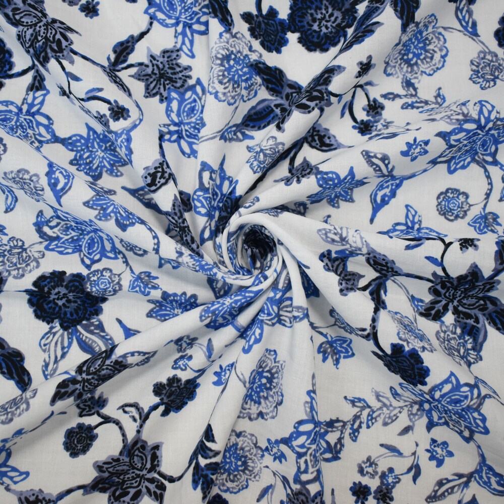 White-Blue-Multi Cotton-Rayon Floral Printed Lawn Woven Fabric By the Yard