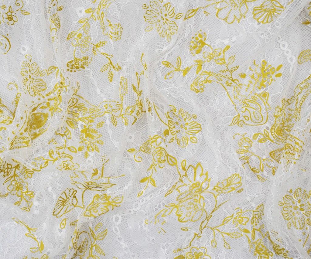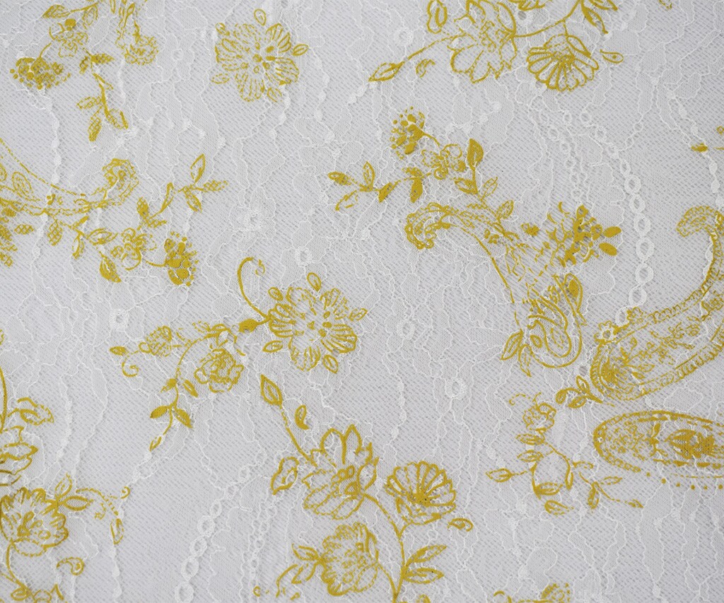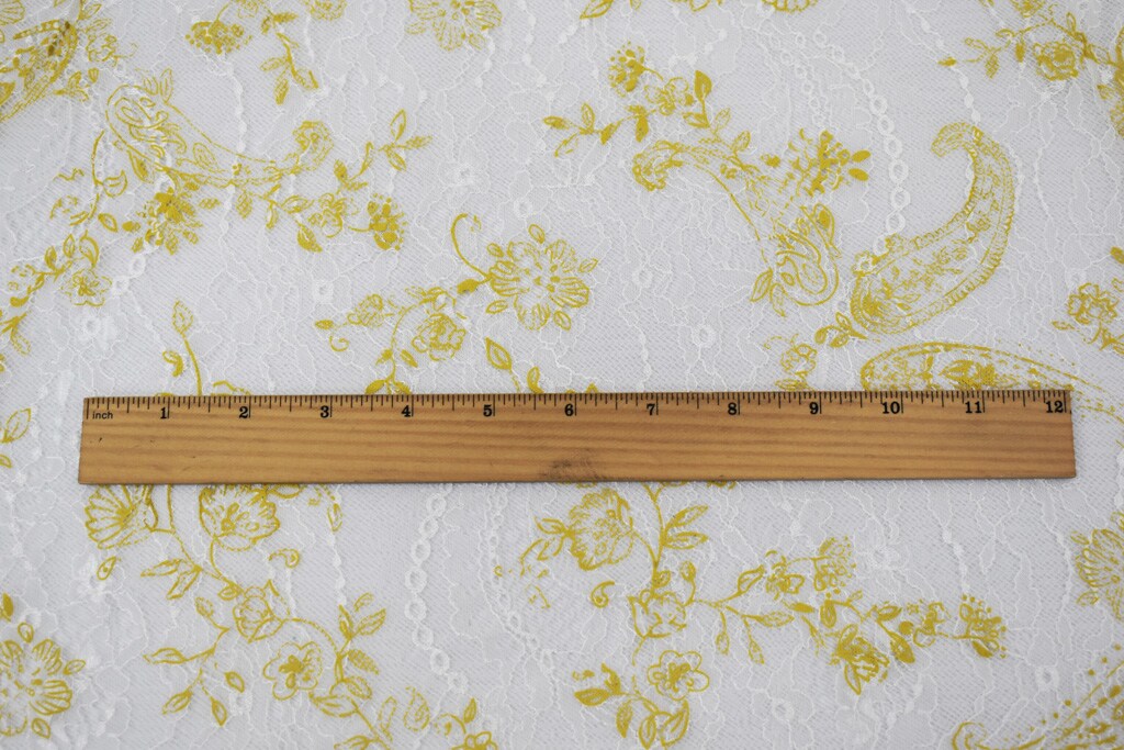 White-Yellow Nylon Floral Paisley Printed Lace Mesh Knit Fabric By the Yard
