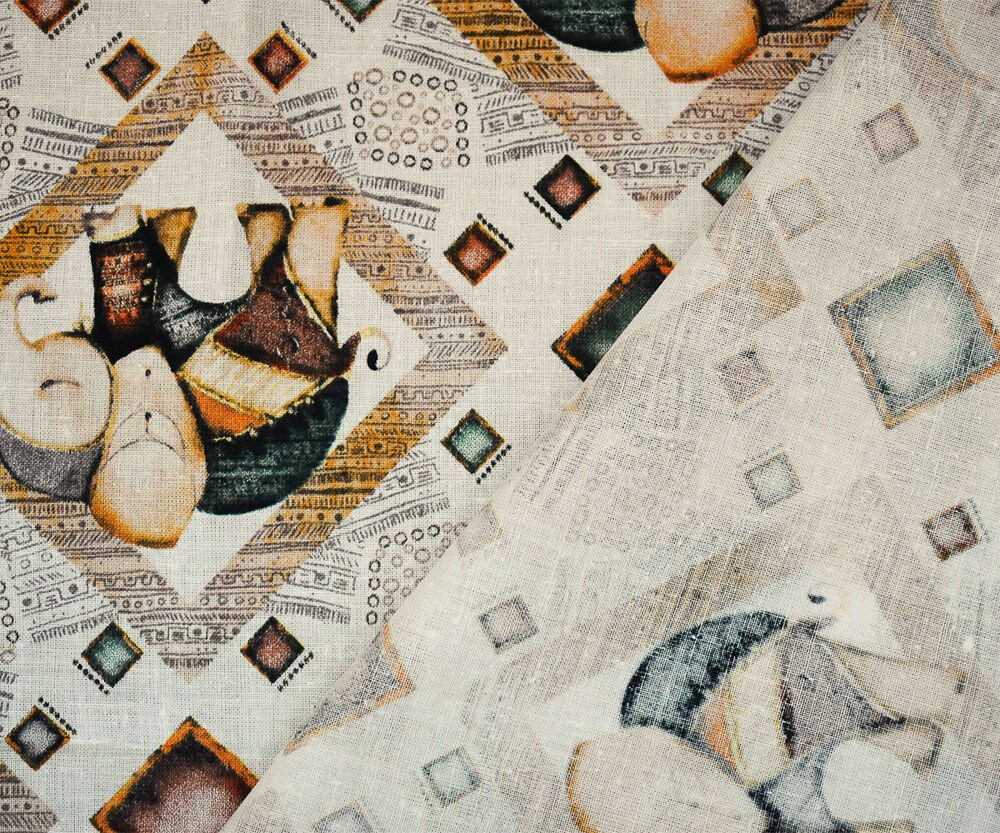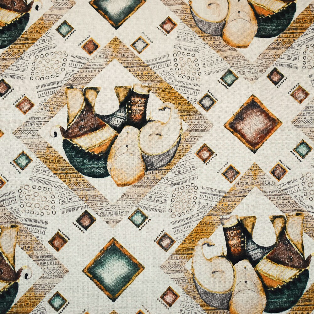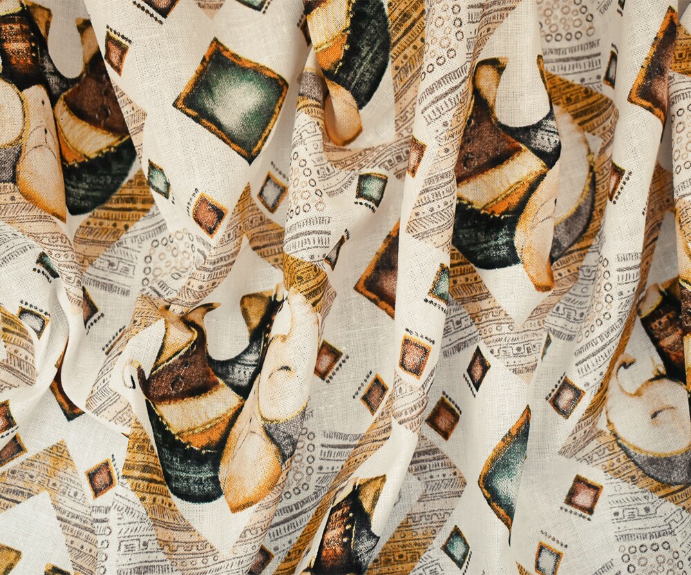 White-Yellow-Multi Elephant Diamond Pattern Printed Linen Woven Fabric By the Yard