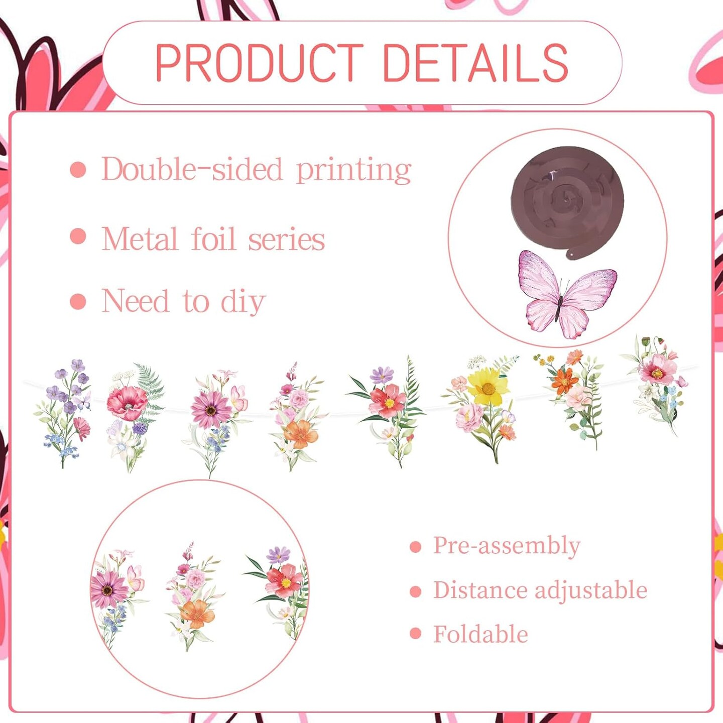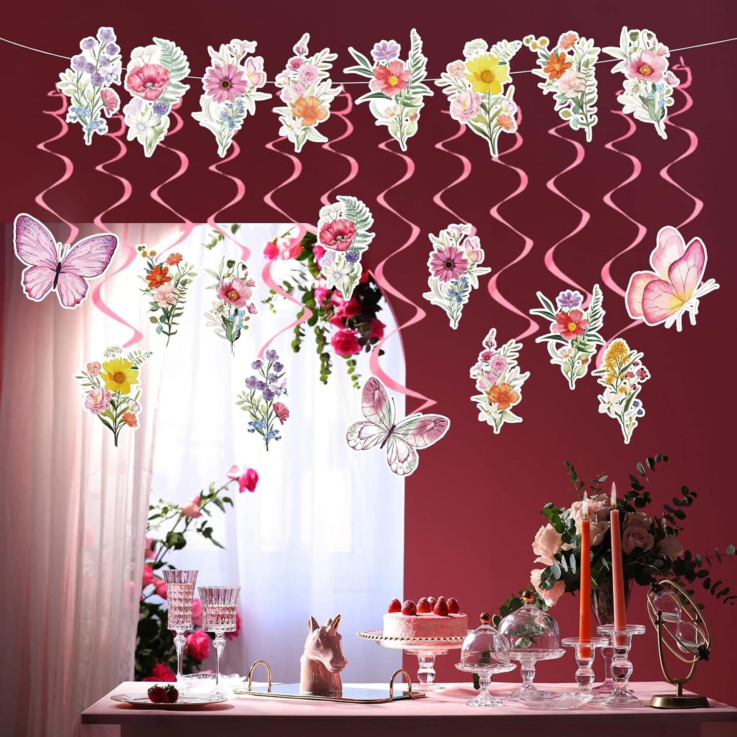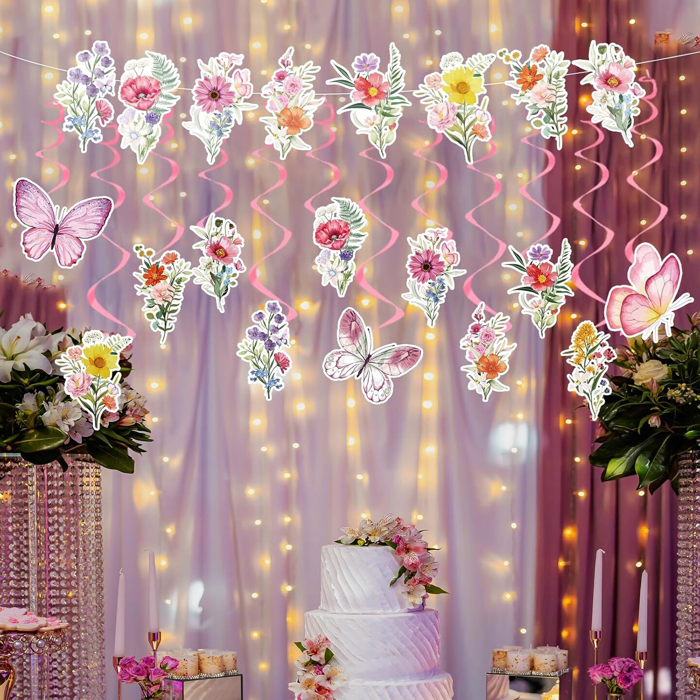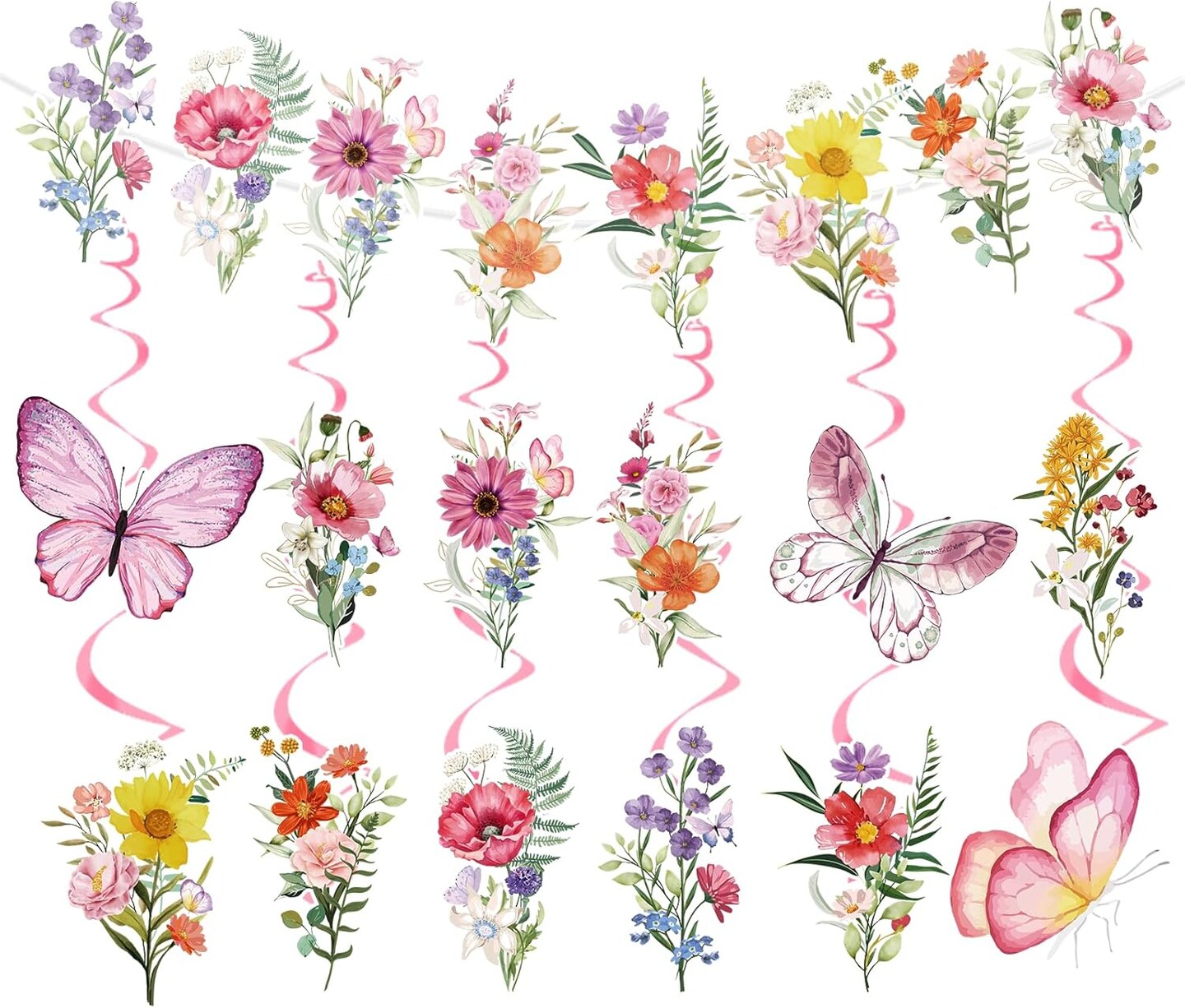 Wildflower Butterfly Party Decorations – 13 Pcs Pink Floral Banner Garland with Hanging Swirls for Birthday, Baby Shower & Garden Party Décor