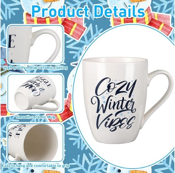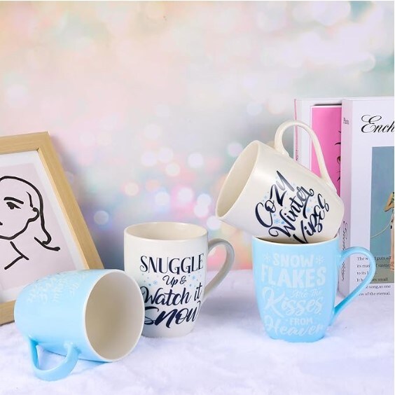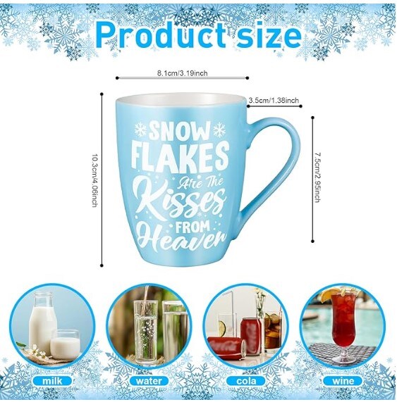 Winter Ceramics Coffee Mugs 11 oz Snowflake Cups 4 Pack Blue Camp Campfire Tea Cups Happy Winter Water Cup Drink Cup Christmas Gift for Mom Dad Grandpa Grandma Home Kitchen Office Fireplace Decor