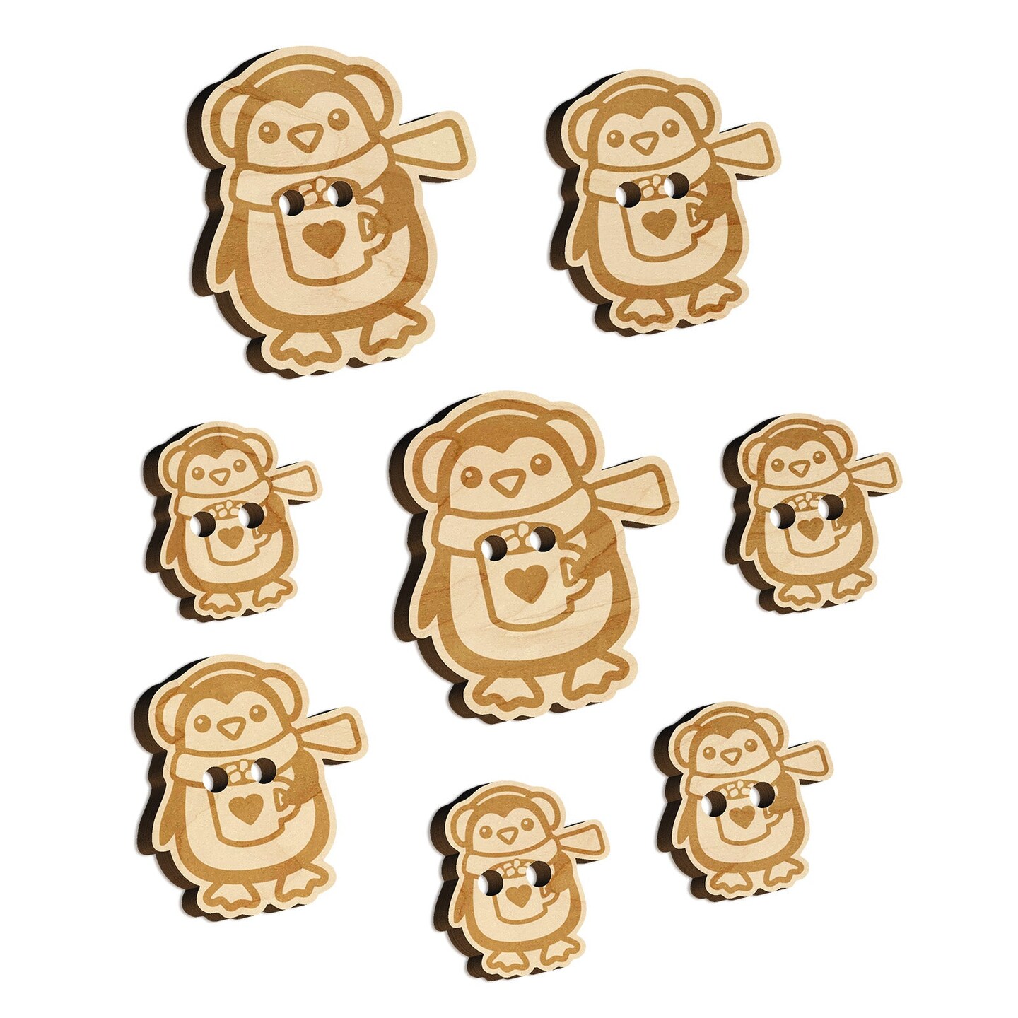 Winter Penguin with Hot Chocolate Heart Mug Wood Buttons for Sewing Knitting Crochet DIY Craft