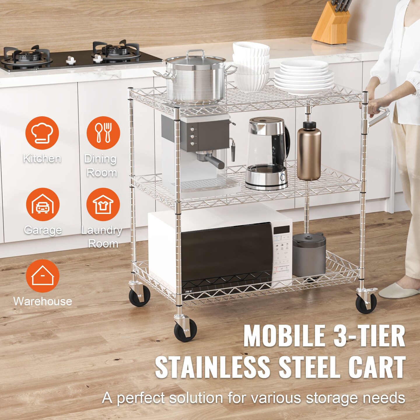 Wire Kitchen Cart, 3-Tier Steel Storage Trolley 661 lbs Capacity, Curved Handle and Hooks