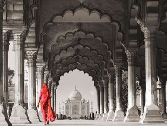 Woman in traditional Sari walking towards Taj Mahal Poster Print by Pangea Images - Item # VARPDX3AP3722