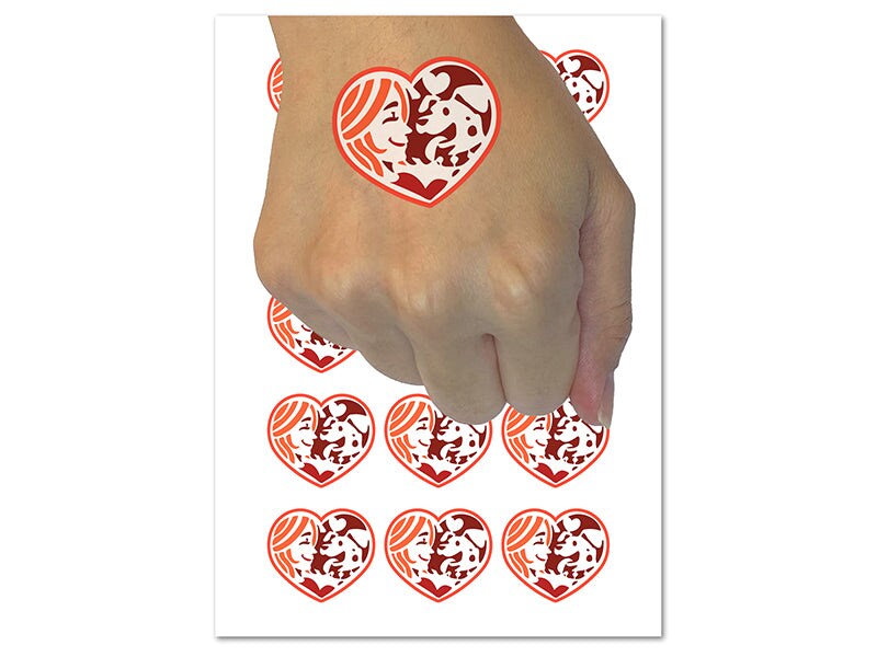 Woman with Dog Puppy Pet in Heart Temporary Tattoo Water Resistant Fake Body Art Set Collection (1 Sheet)