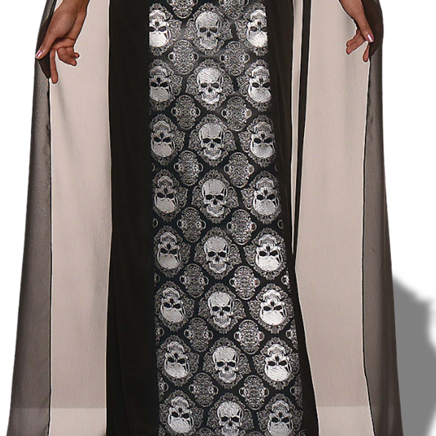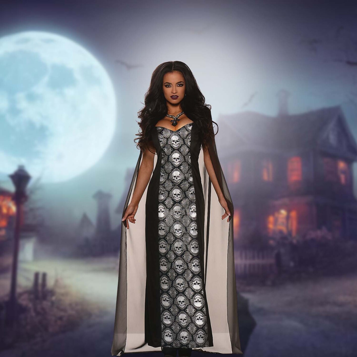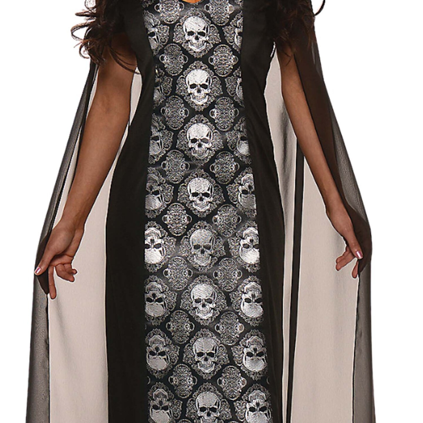 Women Mortalia Costume Full Length Gothic Dress with Skull Trim and Drapes