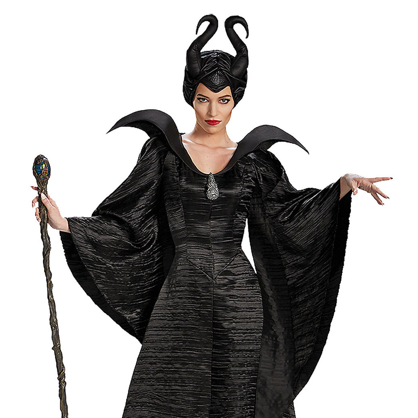 Womens Maleficent Costume Black Satin Gown with Horned Headpiece and Brooch