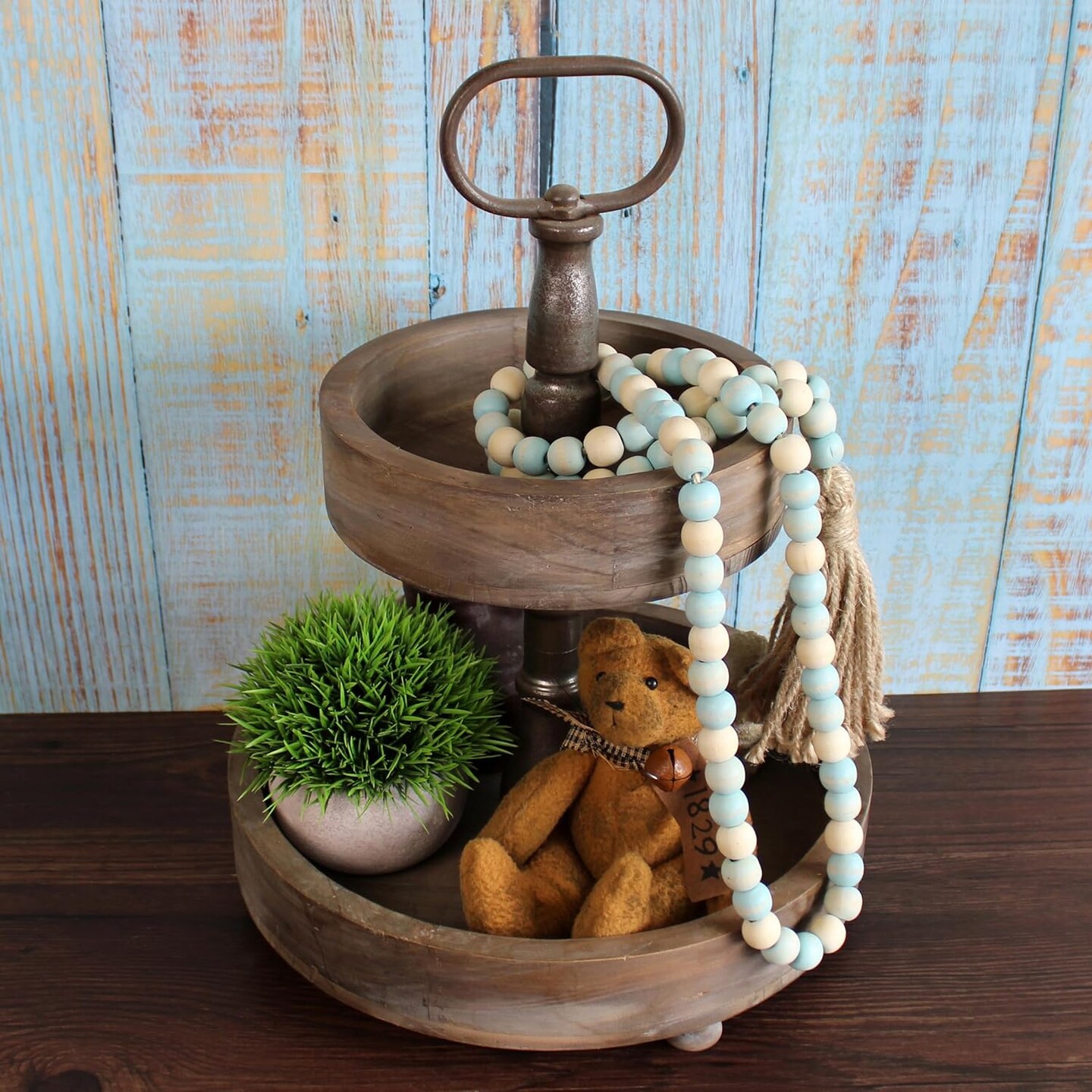 Wood Beads Garland with Tassels Farmhouse Rustic Wooden Prayer Bead String Wall Hanging Accent for Home Festival Decor. Teal Mix Distressed