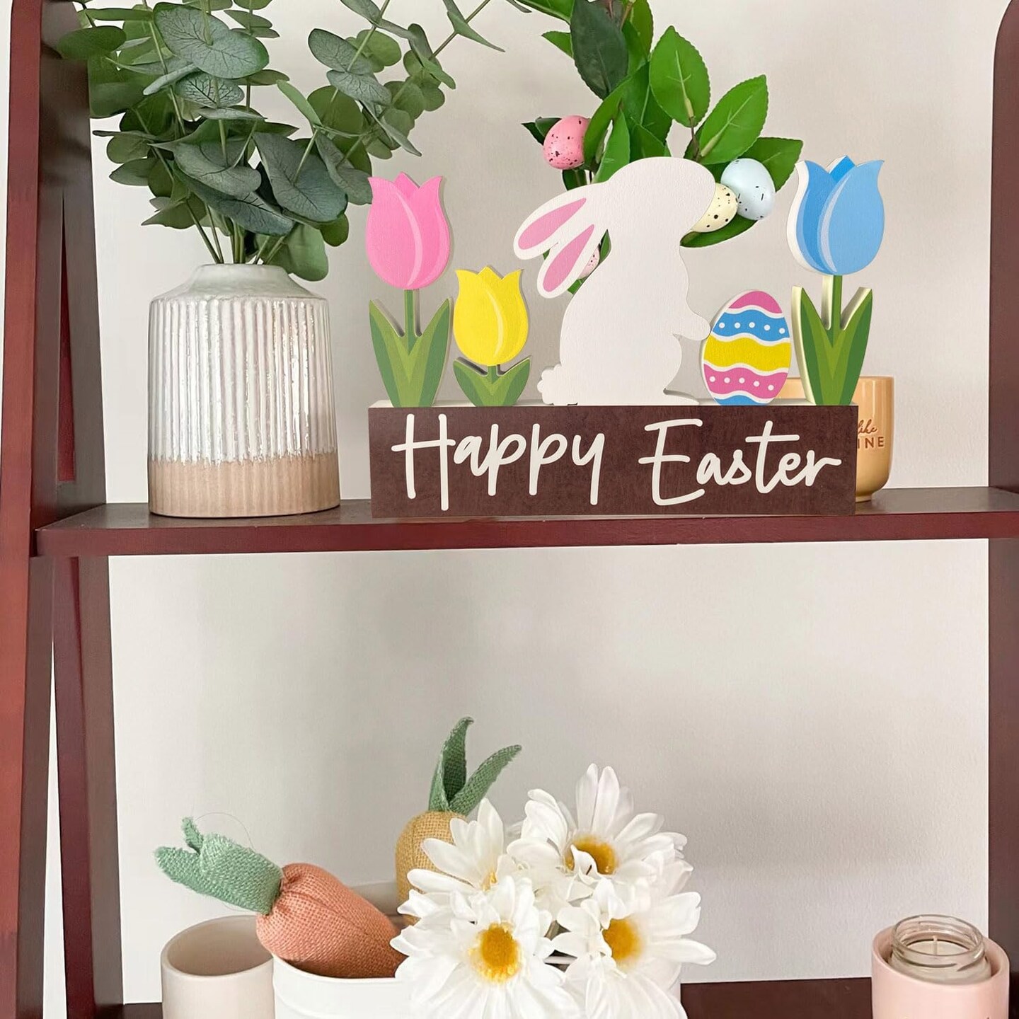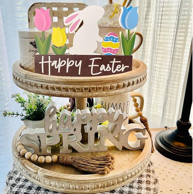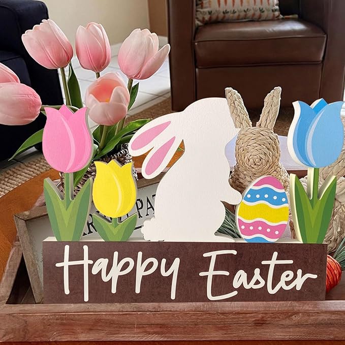 Wooden Bunny Easter Table Decorations Happy Easter Tulips Tiered Tray Decor Rustic Farmhouse Centerpiece Decor Decorative Mantle Tabletop Accent Home Office Wood Sign 6 Pcs Pink Yellow Blue White
