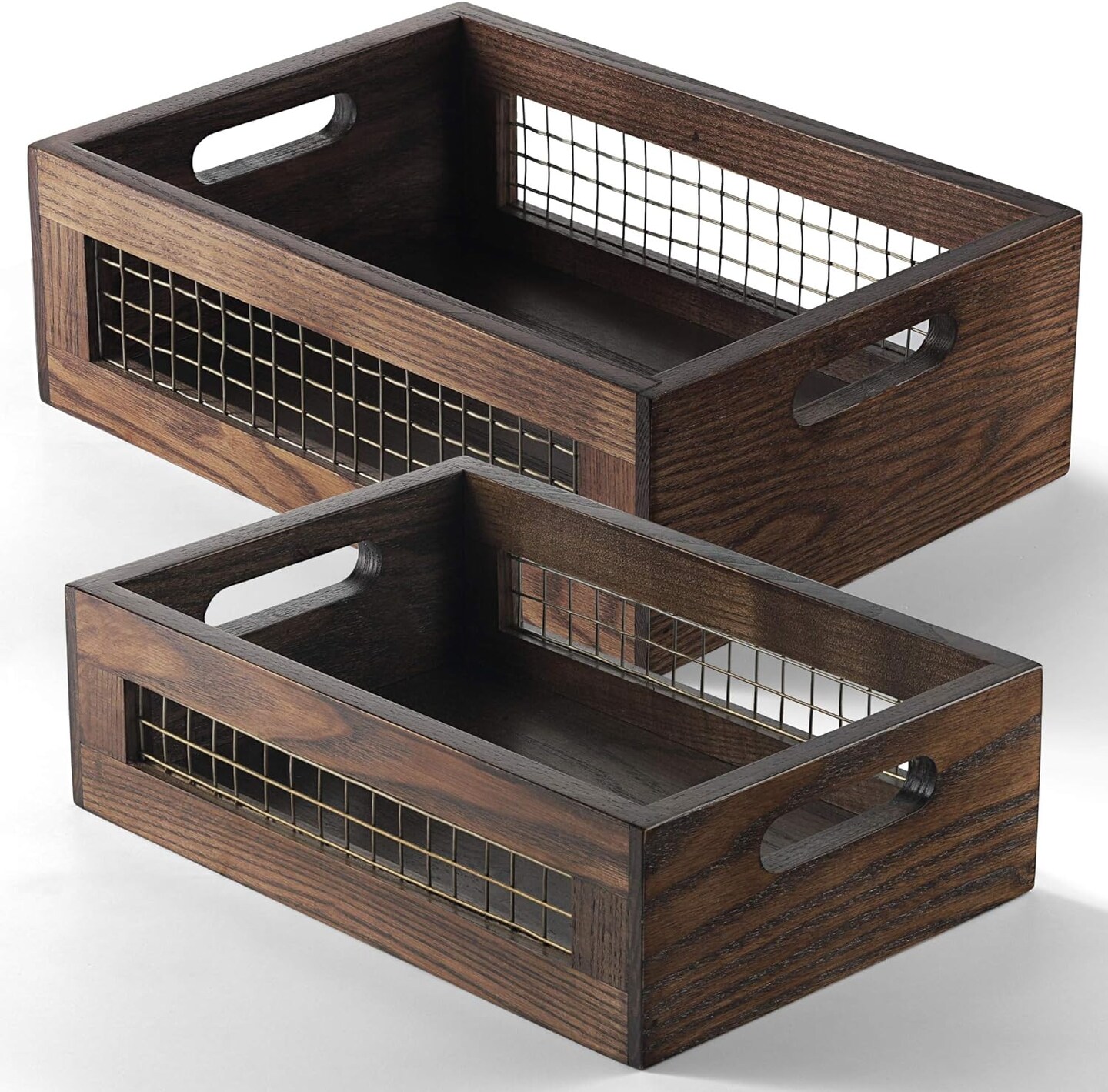 Wooden Countertop Baskets Set of 2 for Kitchen, Bathroom, Pantry|Wall Mount Upgrade with Full Accessories| Rustic Nesting Boxes|Wooden Organizer Crates for Fruit, Vegetables, Produce, Bread
