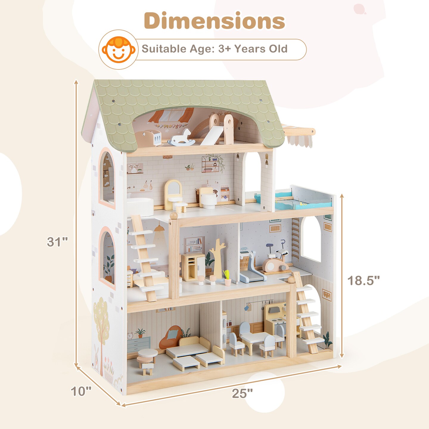 Wooden Dollhouse Kids DIY Pretend Playhouse with 33 PCS Furniture Accessories-Green