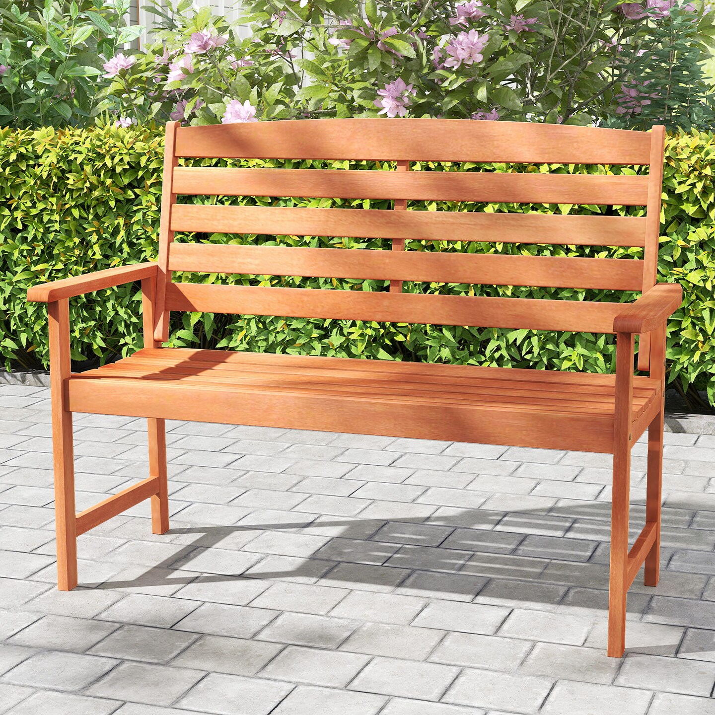 Wooden Garden Bench for 2 with Slatted Backrest and Armrests