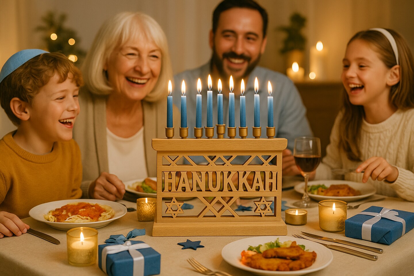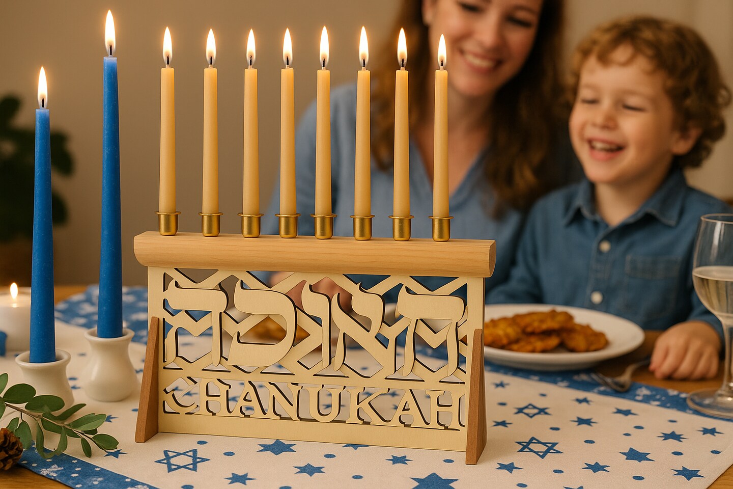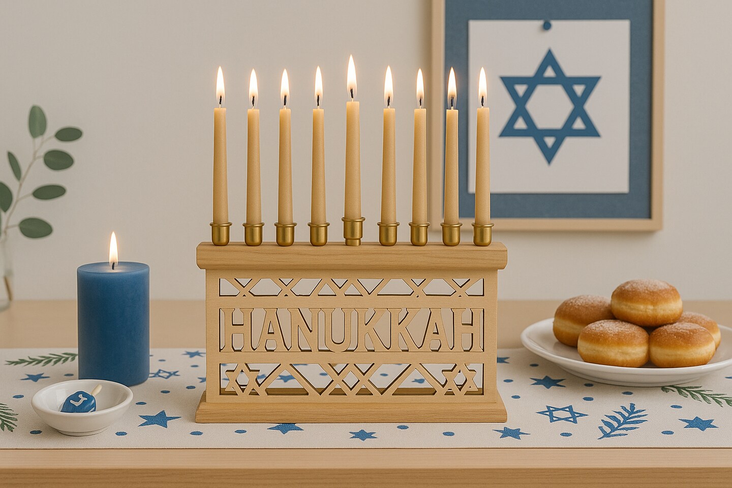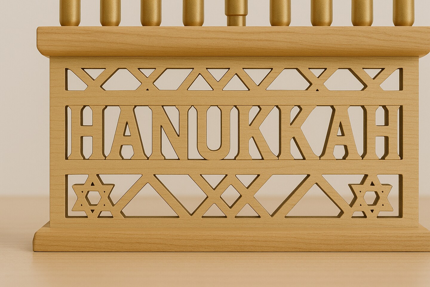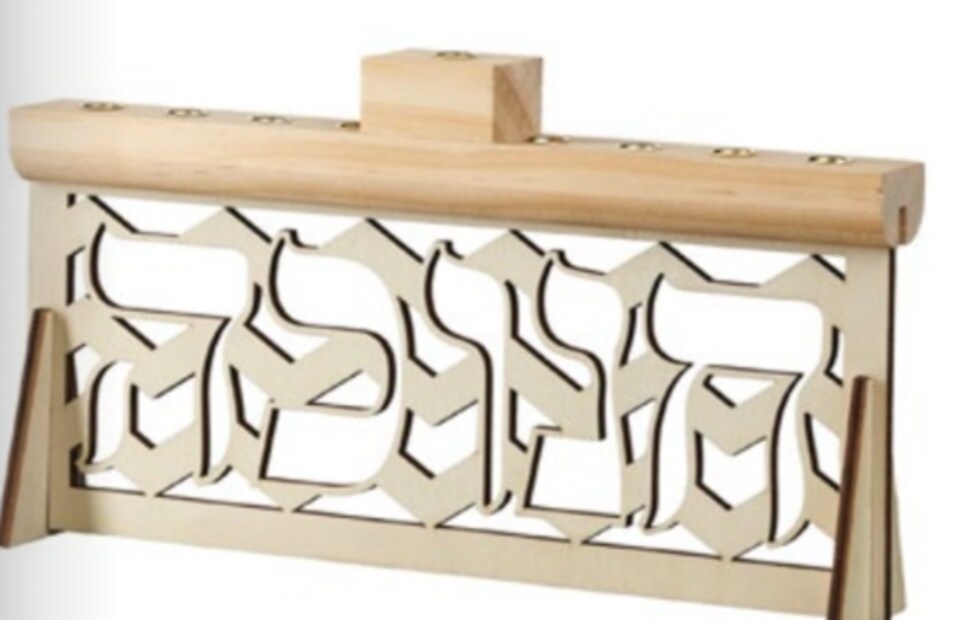Wooden Menorah with Chanukah Hebrew Design – 9" x 5"
