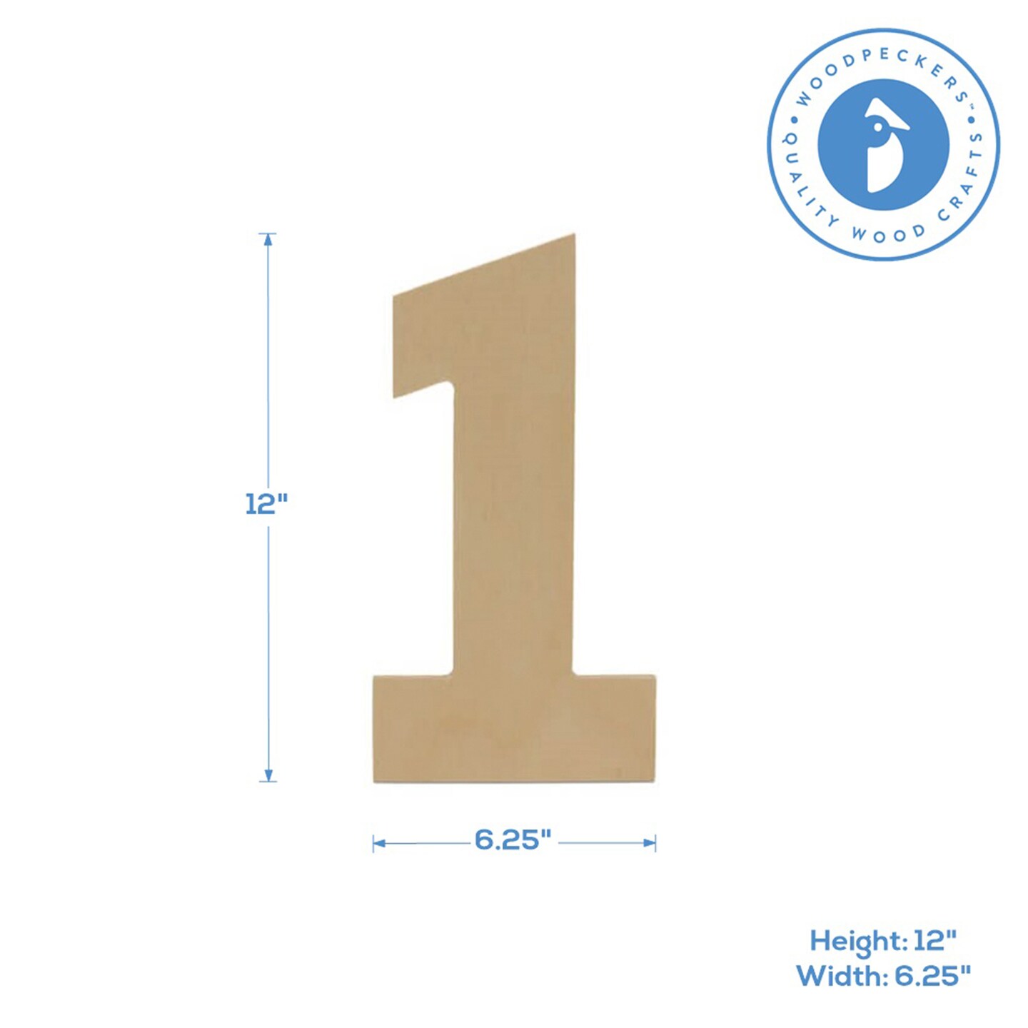 Wooden Number 1, 12 inch or 8 inch, Unfinished Large Wood Numbers for Crafts | Woodpeckers