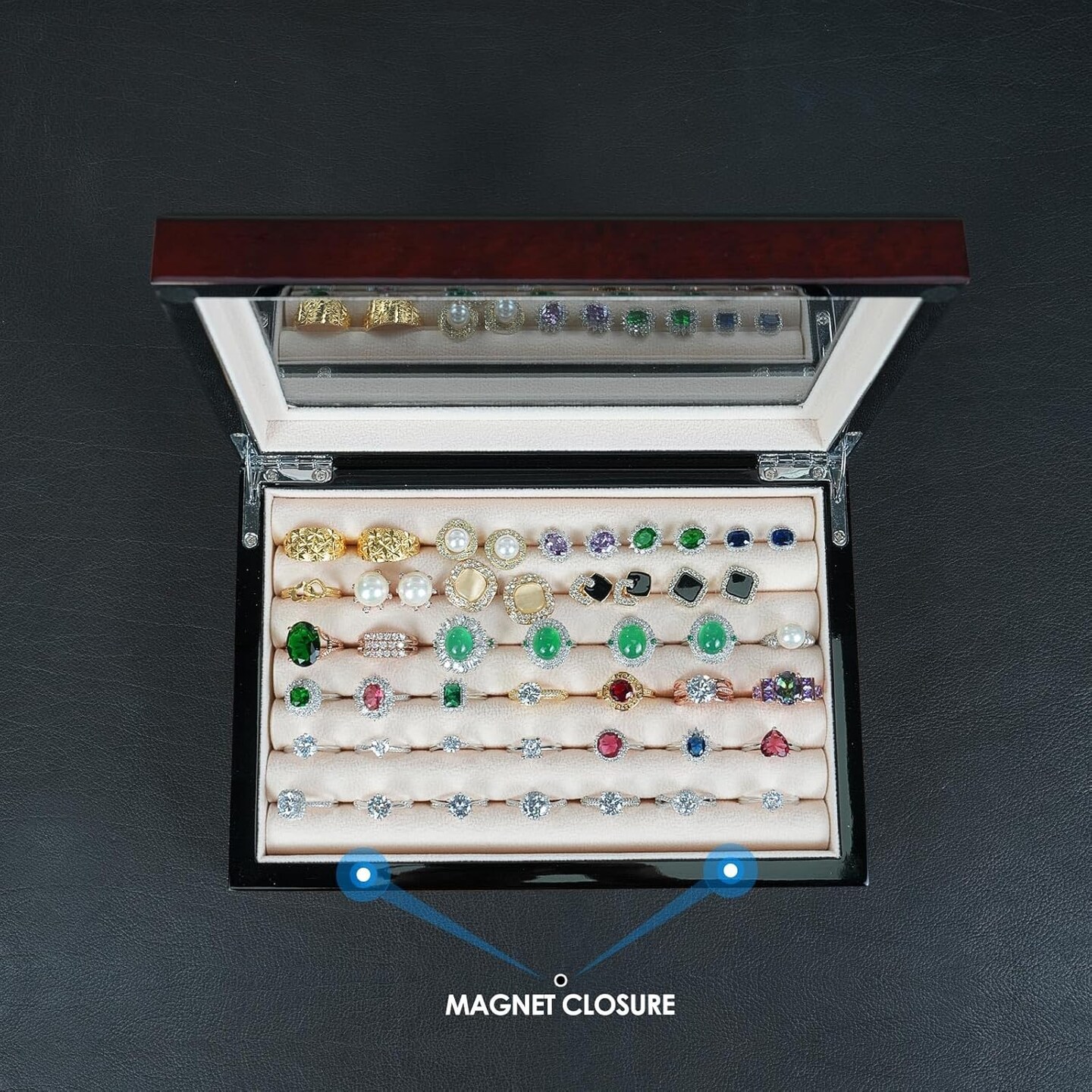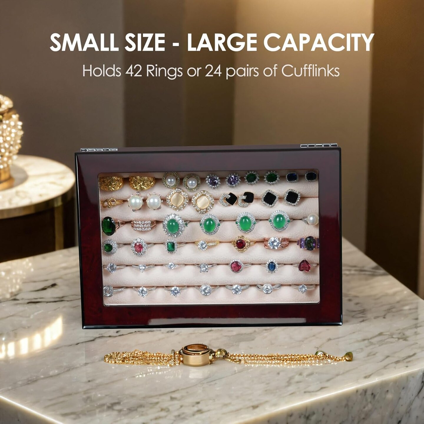 Wooden Ring Box Earring Storage Box Jewelry Organizer for Women, Top Glass Window - Magnet Closure, Men's Cufflink Box At Least for 24 pairs Cufflinks or 40 Rings Holder Display (Burgundy)