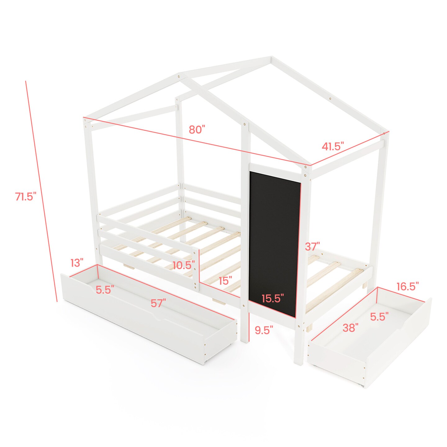 Wooden Twin House Bed with Storage Drawers Blackboard and Guardrails for Kids