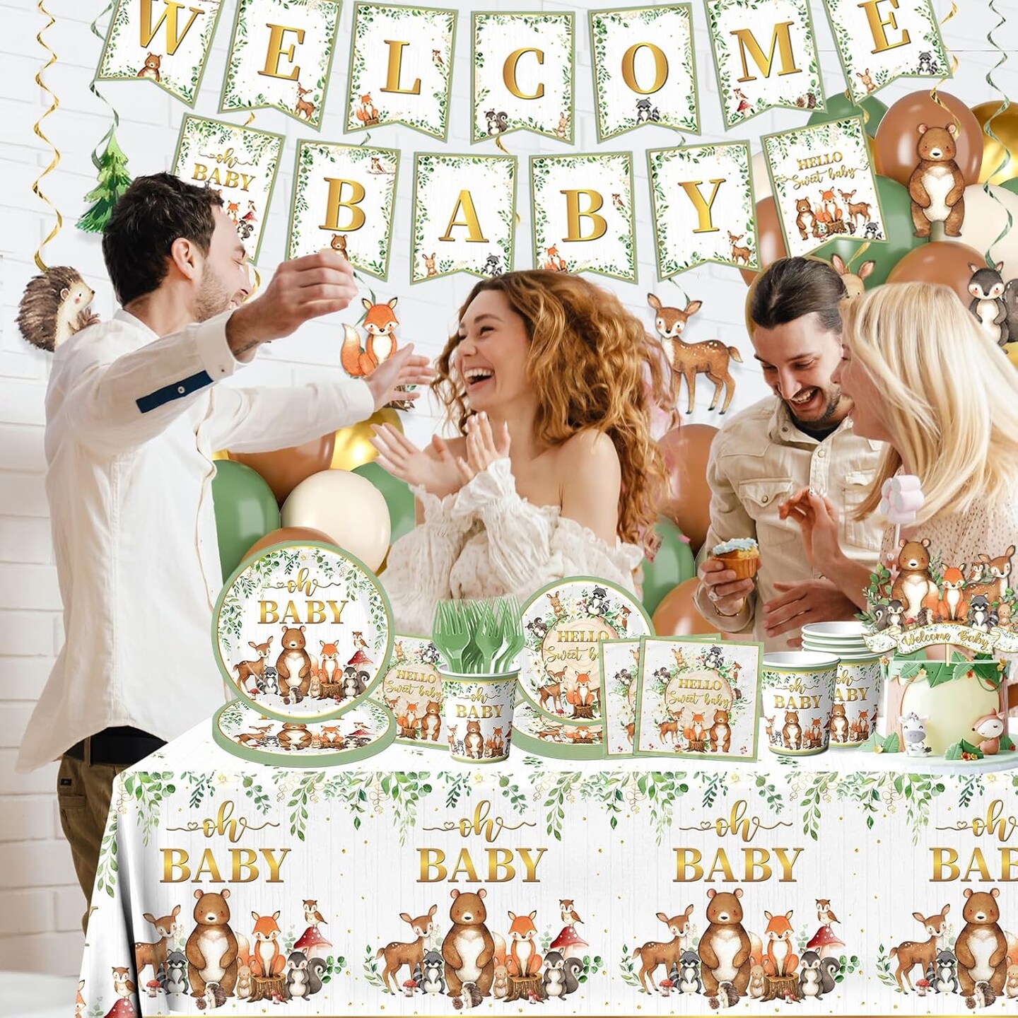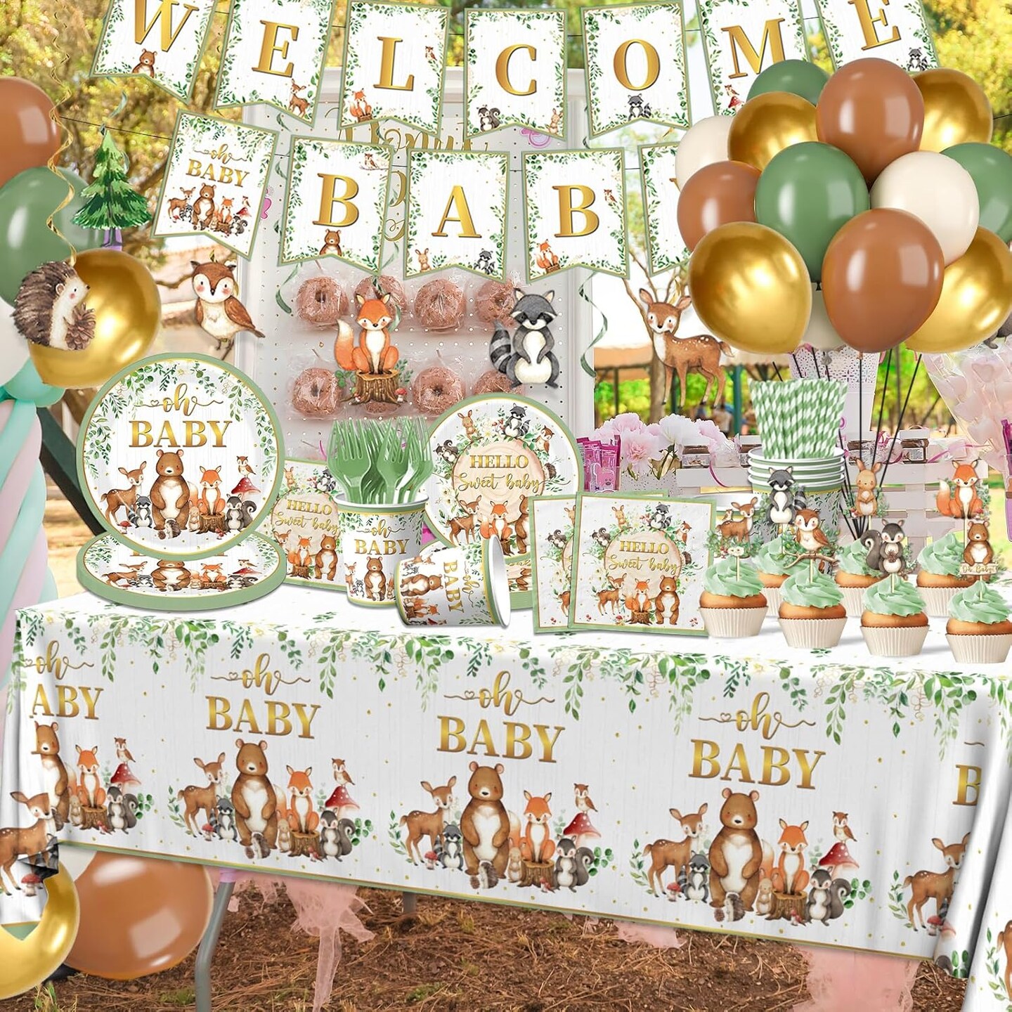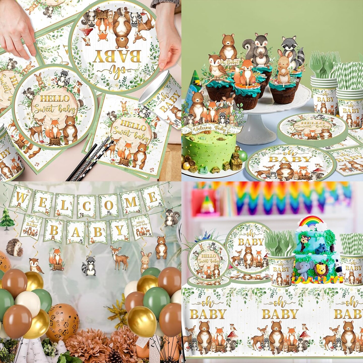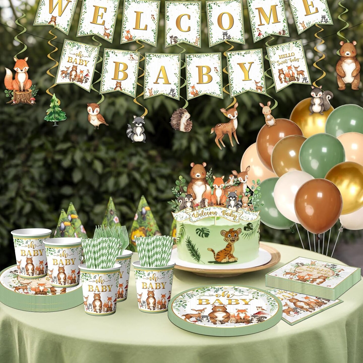 Woodland Baby Shower Decorations,196pcs Woodland Baby Shower Plates and Napkins Cups Sage Forest Animals baby Shower Tablecloth Cake Toppers Balloons for Boy Babys Shower Decorations