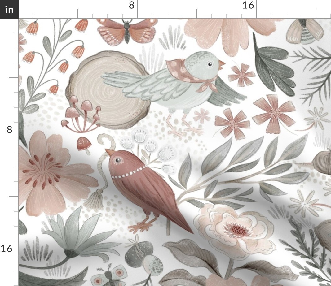 Woodland Birds Forest Nursery And Branches Pink Flowers Pastel Eggs Custom Printed Fabric by Spoonflower Various Fabrics by the Yard or Fat Quarter