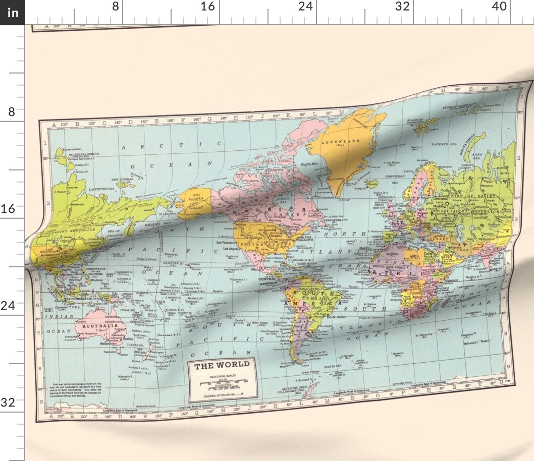 World Map Vintage Colorful Custom Printed Fabric by Spoonflower Various Fabrics by the Yard or Fat Quarter