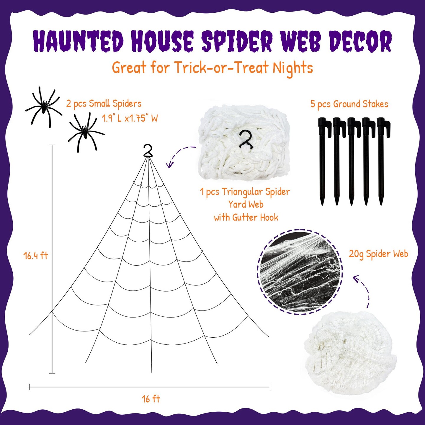 Wrapables 16ft Giant Triangular Spider Web Kit with Cobwebs and 2 Small Spiders, Indoor Outdoor Haunted House Halloween Decor