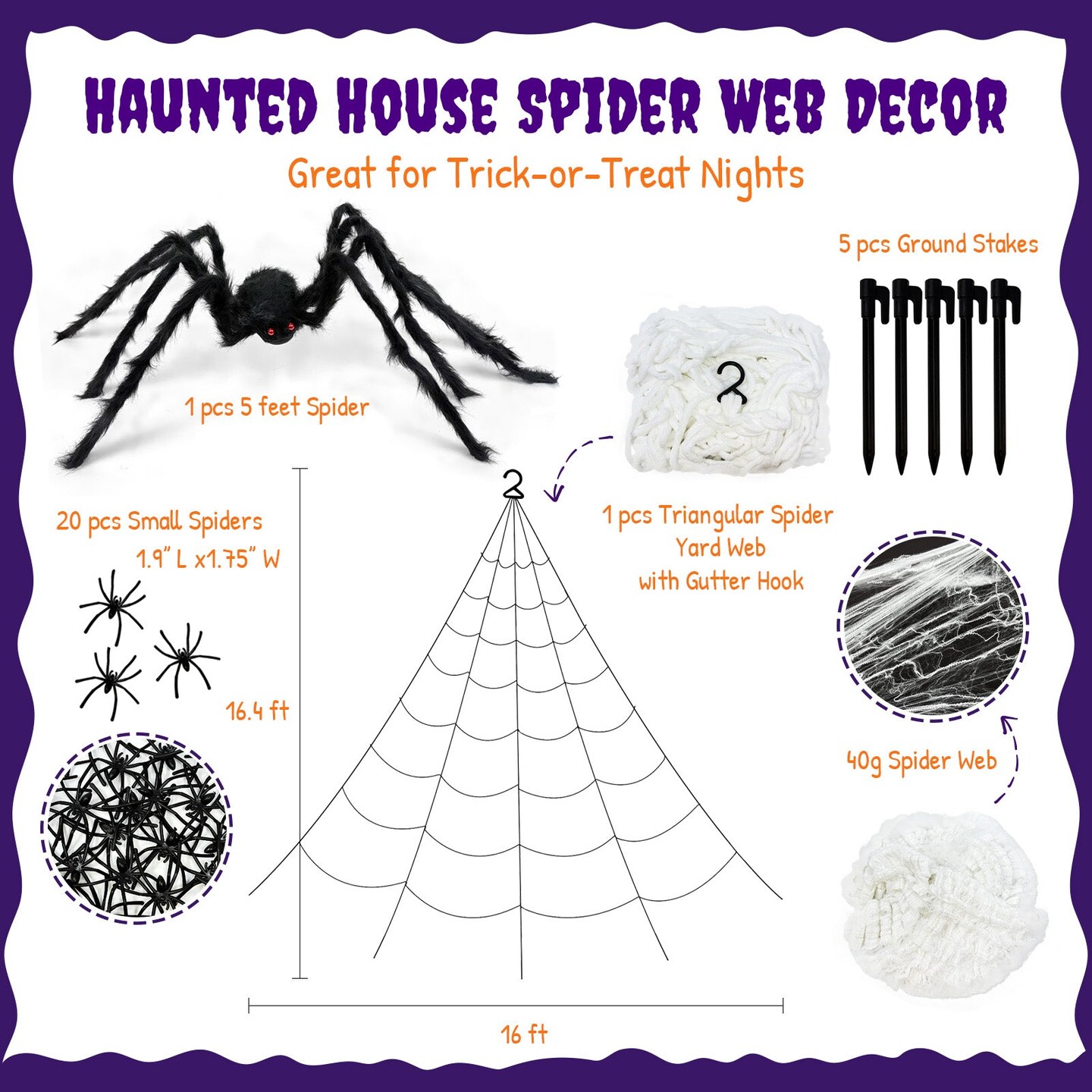 Wrapables 16ft Giant Triangular Spider Web Kit with Cobwebs and 5ft Large Spider + 20 Small Spiders, Indoor Outdoor Haunted House Halloween Decor