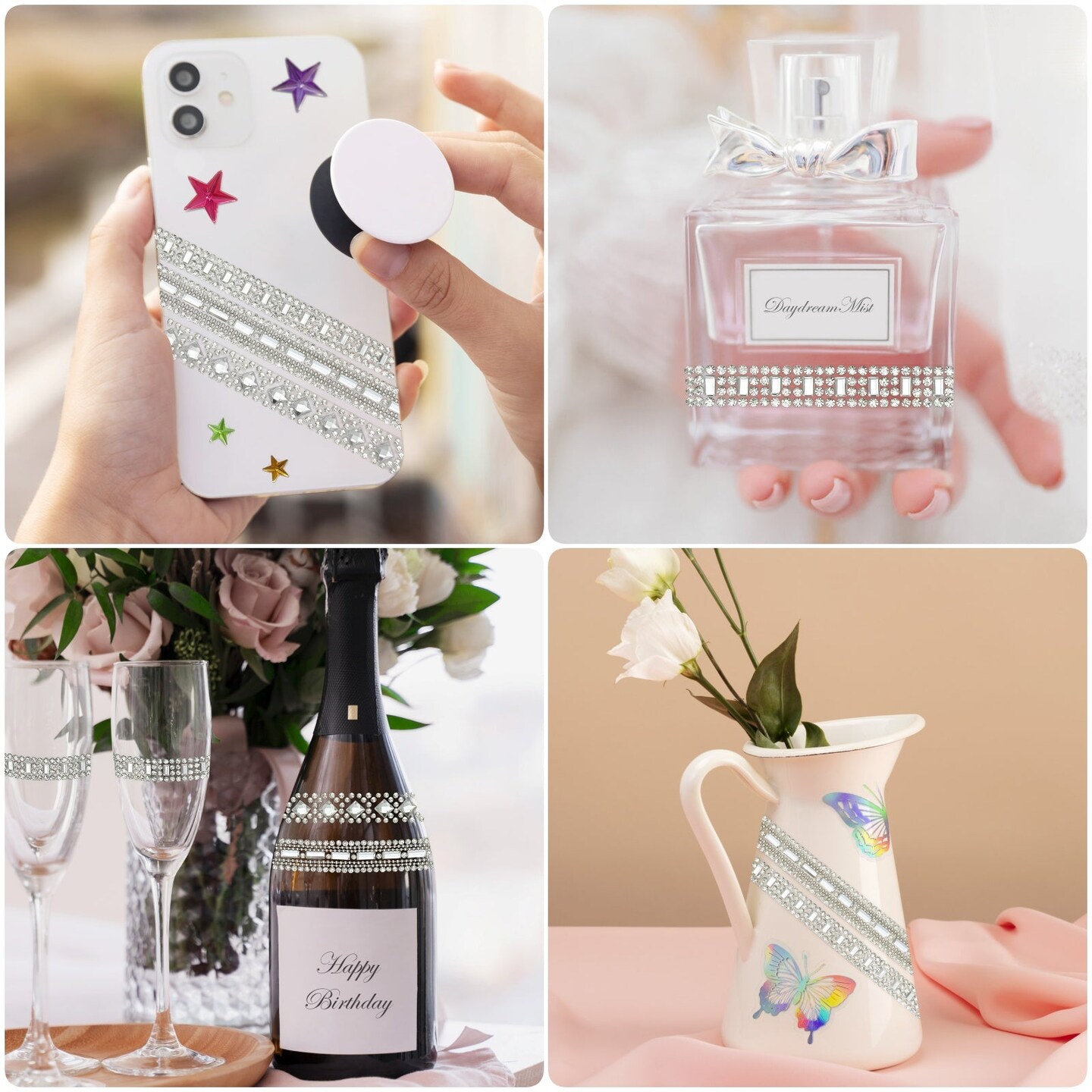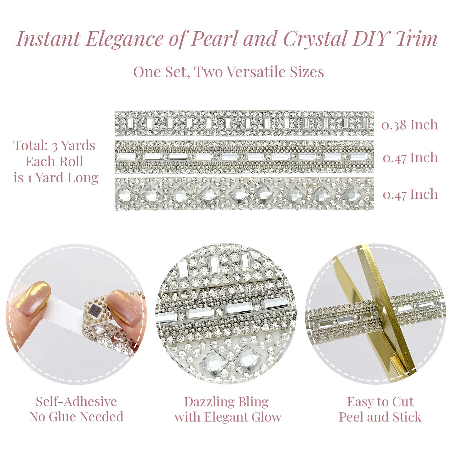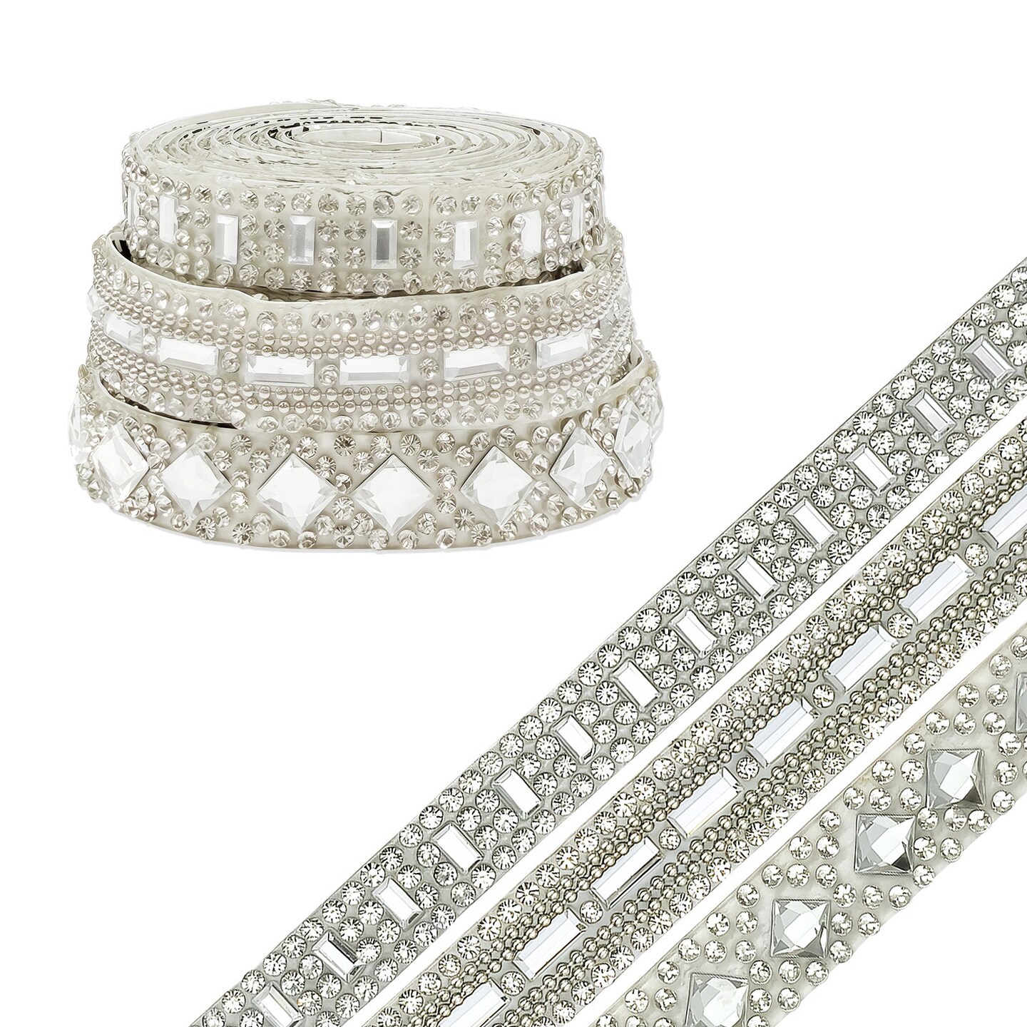 Wrapables 3 Yards Self Adhesive Crystal Rhinestone Ribbons, Diamond Bling Tape Strips Trim for DIY Crafts Wedding Party Decoration (3 Rolls), Silver