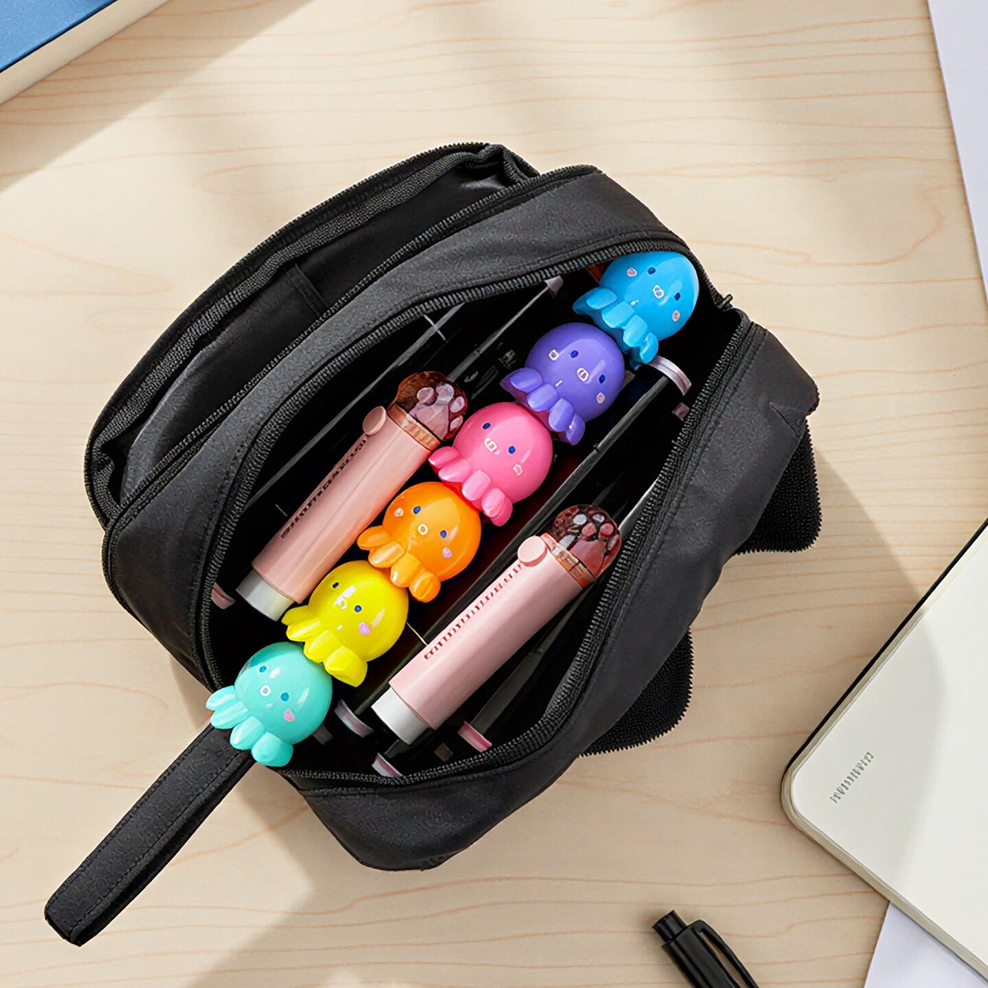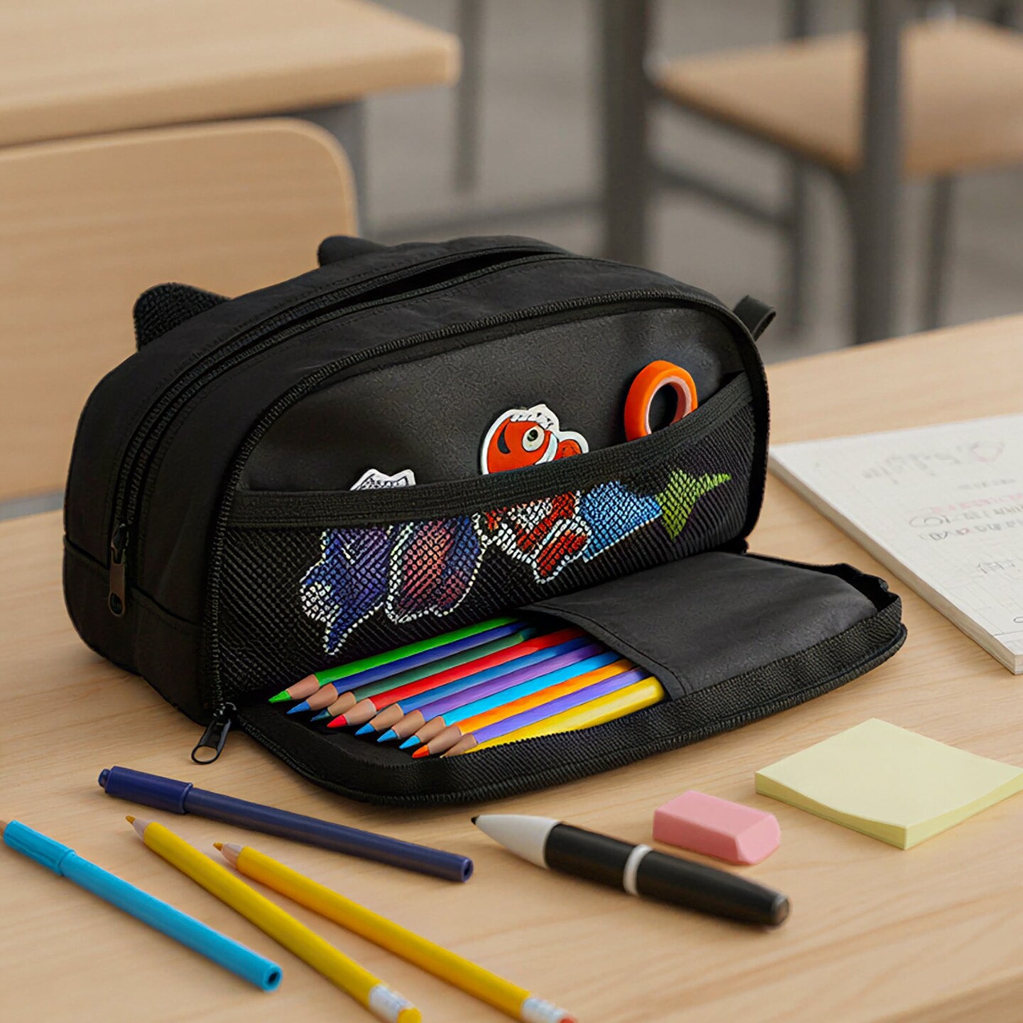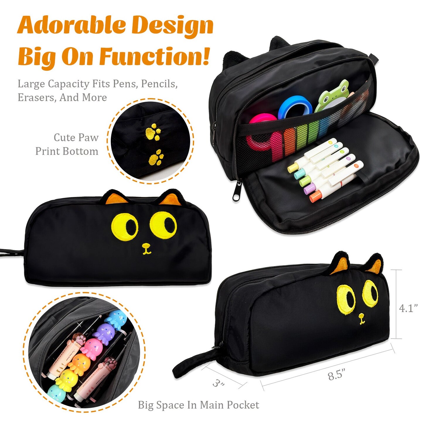 Wrapables 3D Animal Face Pencil Case, Large Capacity 2 Compartment Pencil Pouch for Stationery Tools, Black Cat