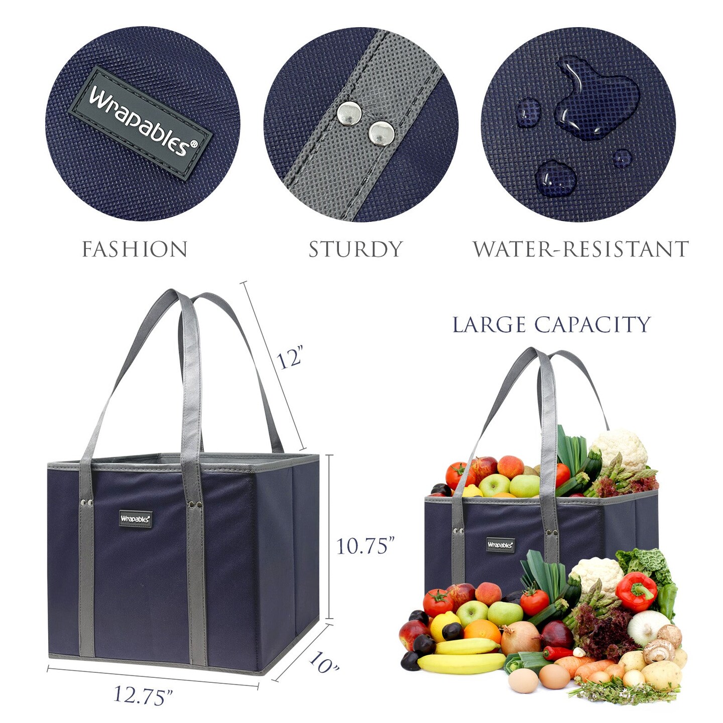Wrapables 3Pk Reusable Grocery Bags, Heavy Duty Large Foldable Storage Shopping Totes with Reinforced Handles, Navy