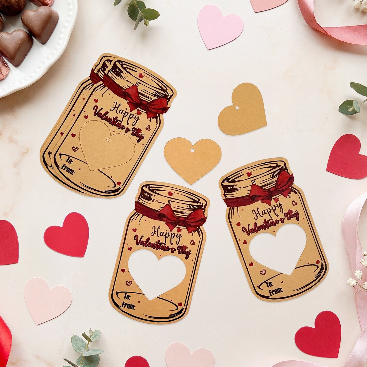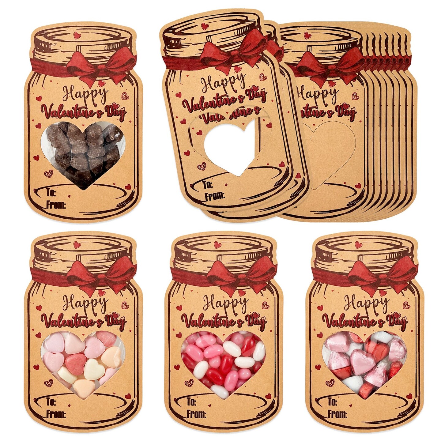 Wrapables 48pk Valentines Day Card Set, Mason Jar Happy Valentines Cards with Party Favor Bags for Classroom Exchanges (Candy Not Included)