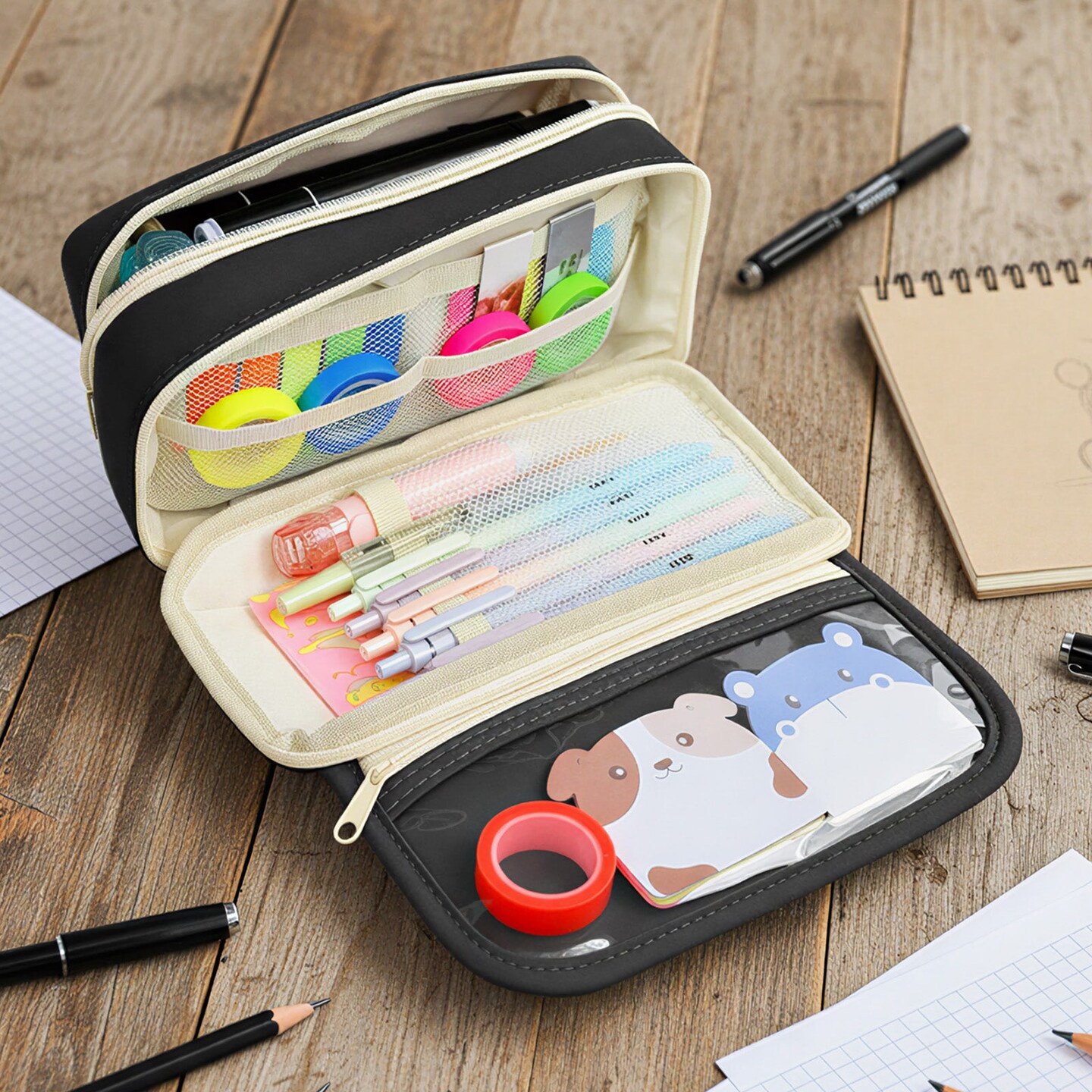 Wrapables 9-Layer Large Capacity Pencil Case with Transparent Compartment, Organizer Pouch for Stationery Tools, Makeup, and Travel, Black