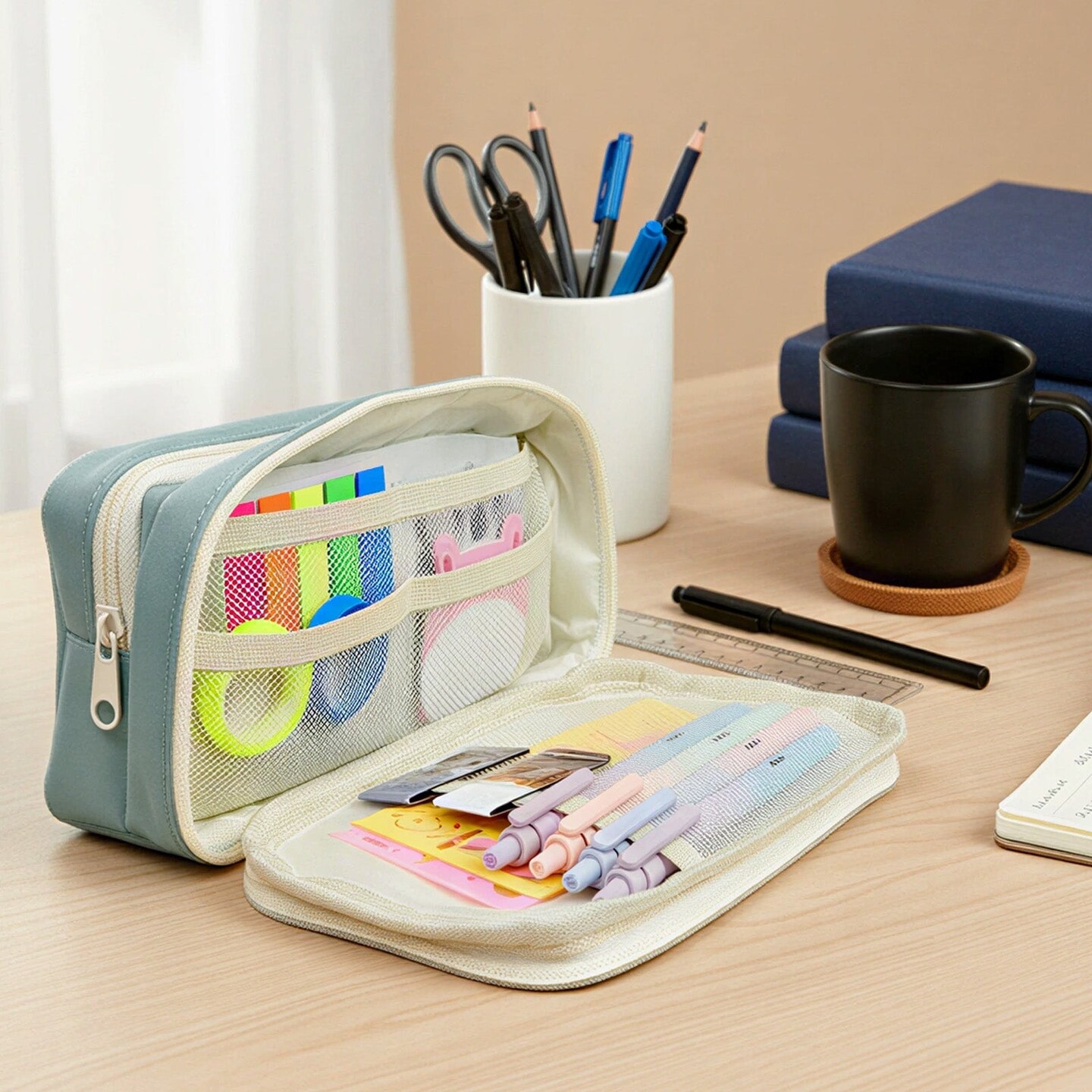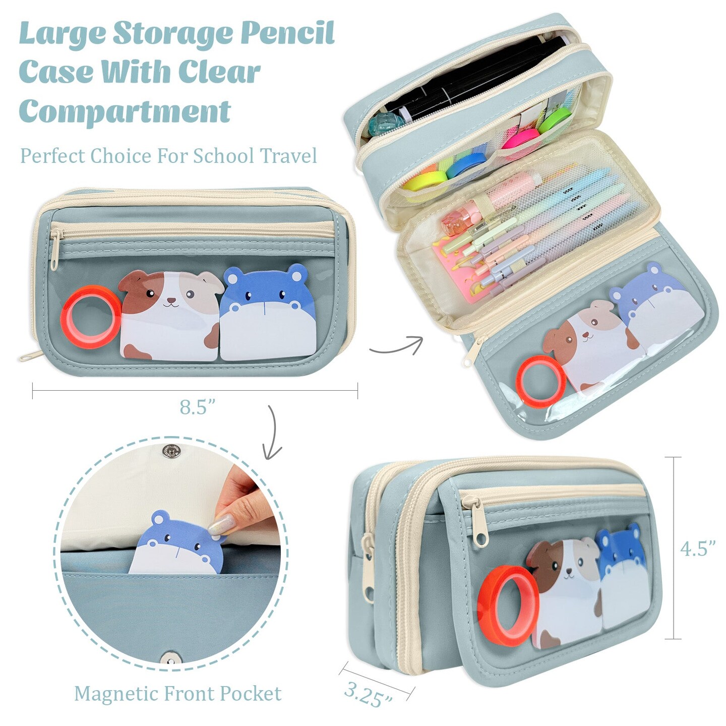 Wrapables 9-Layer Large Capacity Pencil Case with Transparent Compartment, Organizer Pouch for Stationery Tools, Makeup, and Travel, Blue