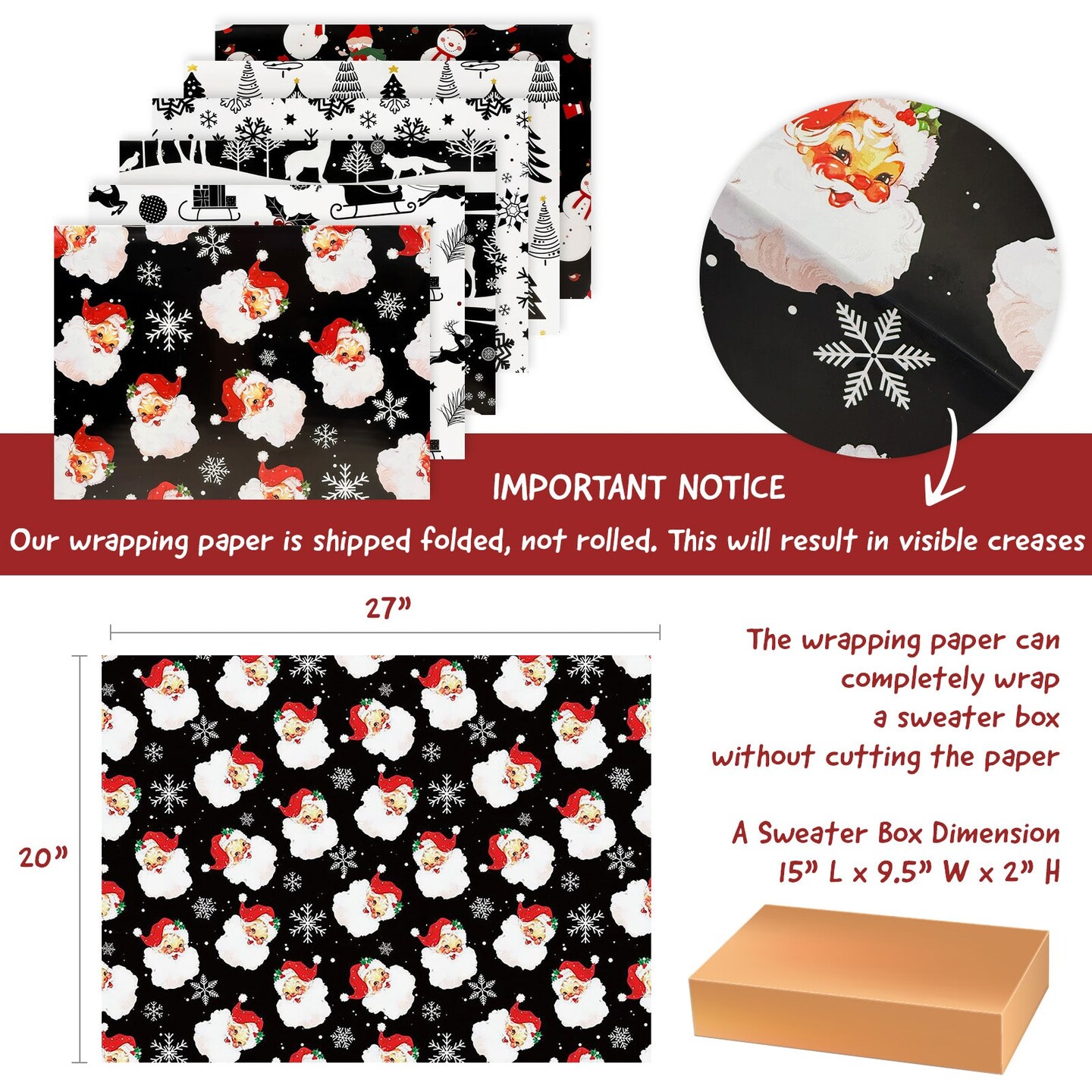 Wrapables Christmas Holiday Gift Wrap Paper Sheets Folded Flat 20L x 27W inches (12 Sheets), Black and Red