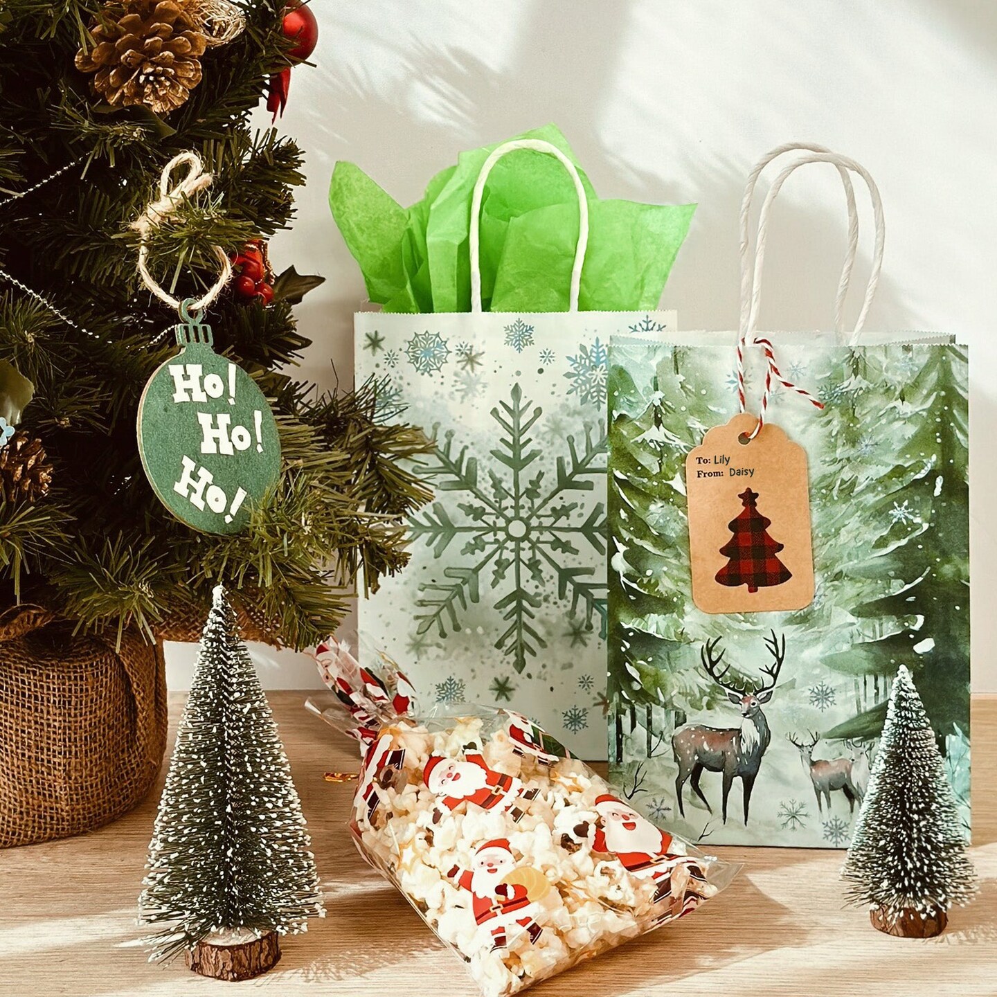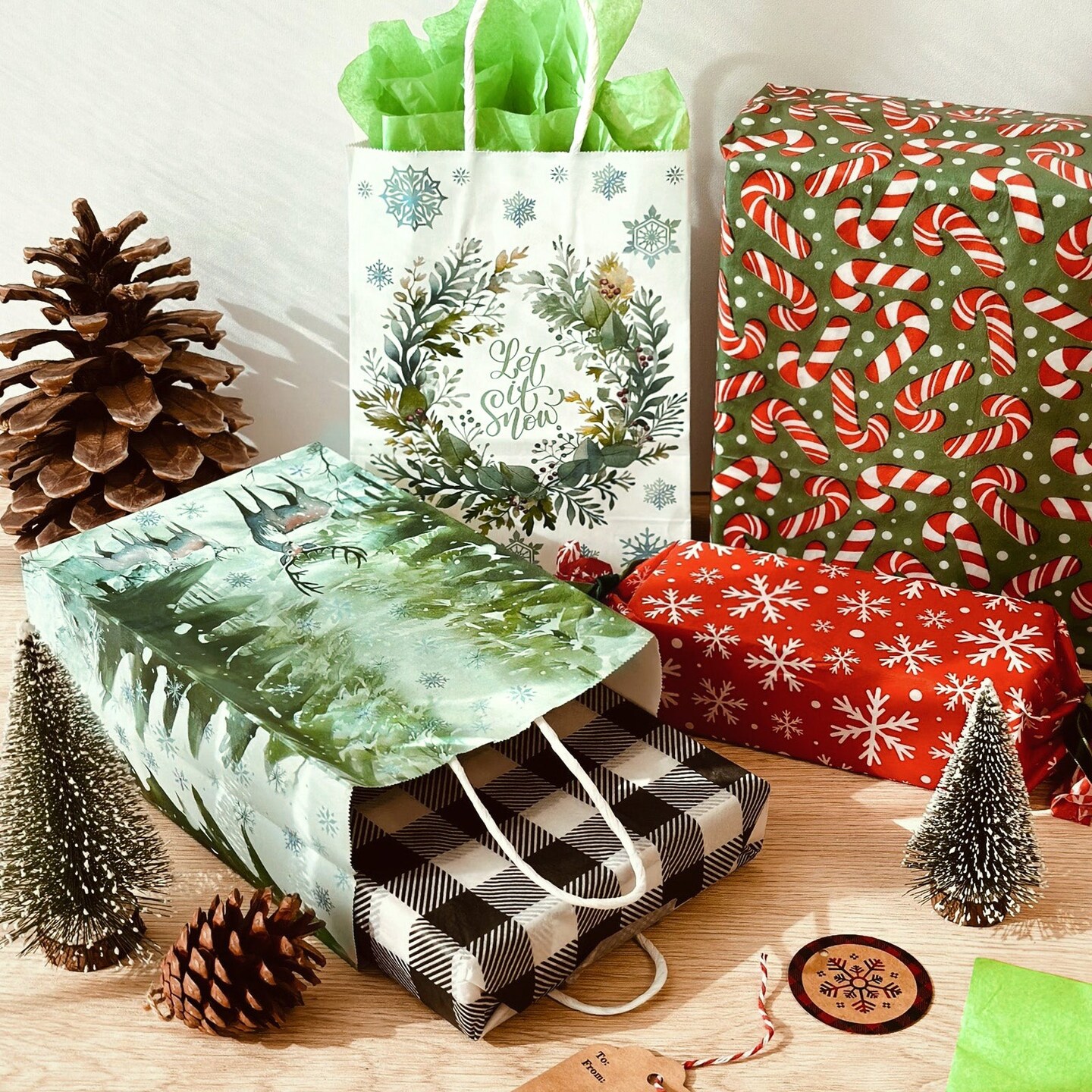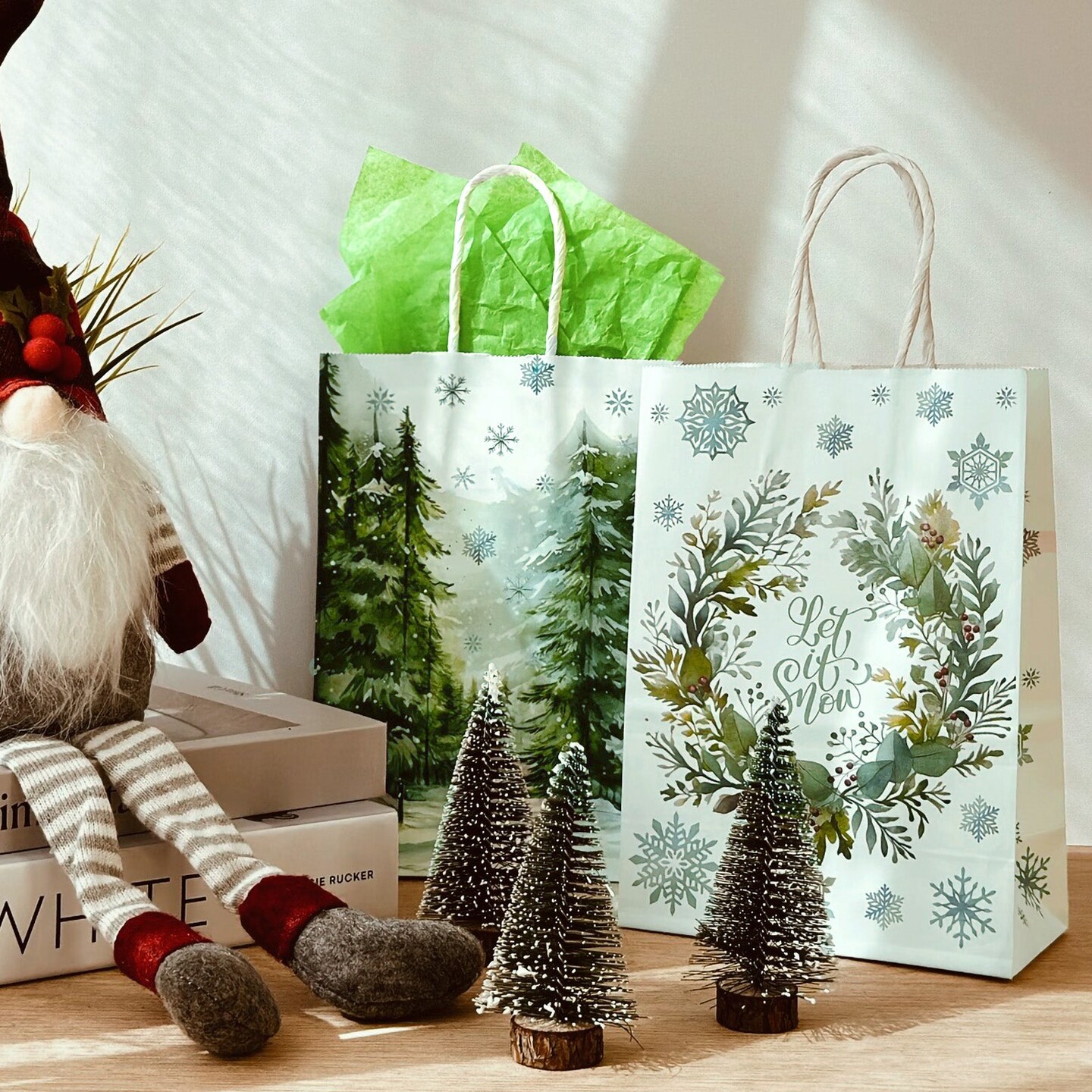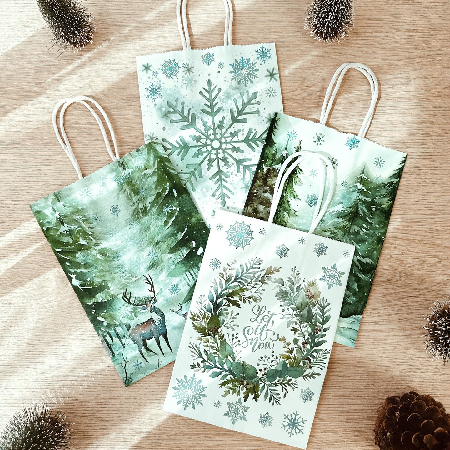 Wrapables Christmas Holiday Kraft Gift Bags with Handles and Tissue Paper for Gift Wrap, Parties, Favors and Treats (Set of 12), Green Winterland