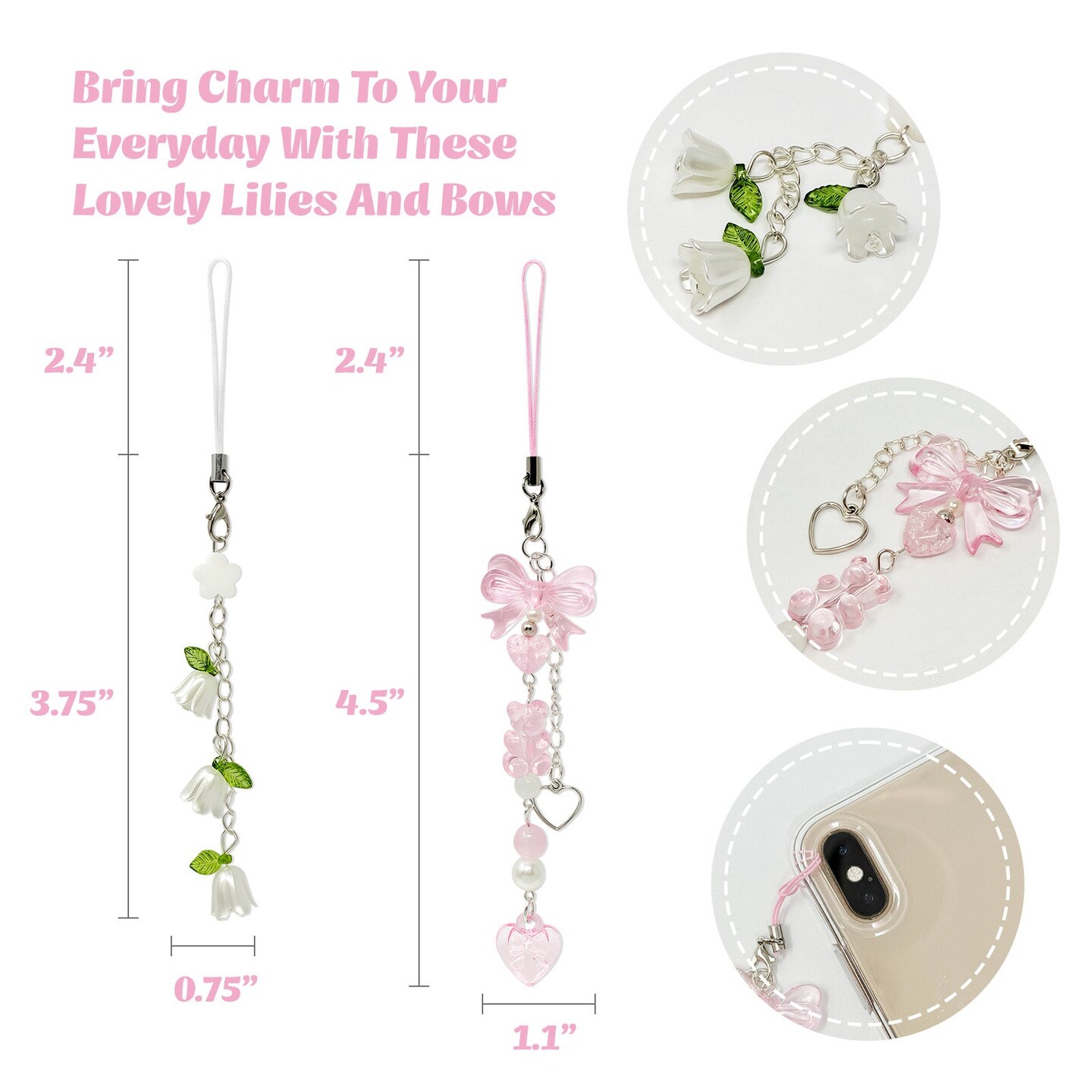 Wrapables Cute Aesthetic Y2K Cell Phone Charms, Accessories for Keychain Handbag Pendant (Set of 2), Lilies and Bows